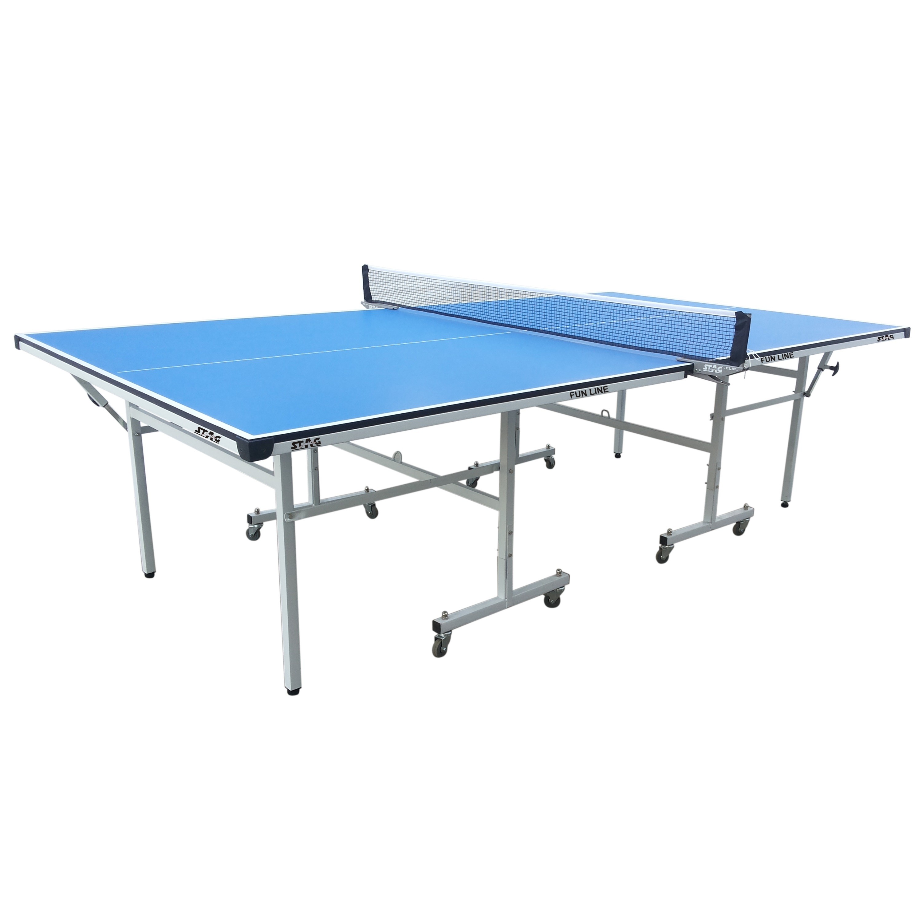 Тенісний стіл Stag Fun TTTA-142 використовується для тренувань, вироблення точних ударів, швидкості пересування і певної стратегії гри. Столи встановлюються в клубах, розважальних центрах, школах, вдома. Товщина стільниця 15 мм, ламінована, має хороший відскік, зносостійкість. Стіл розкладається, не займе багато місця в кімнаті, спортзалі. Модель розрахована не тільки для сімейного відпочинку, розваг, а й підготовки майбутніх чемпіонів.