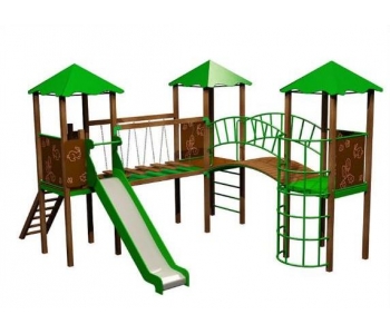 Вікова категорія від 2 до 14 років. Даня дитячий майданчик відмінно підійде для приватного ділянки, дитячого комплексу або ігрового парку. Дитячий майданчик складається з трьох башт з платформами, дитячої гірки, прямого рухомого на ланцюги і опуклого містків, напівкруглої лазалкі і двох різних сходів.