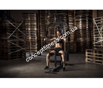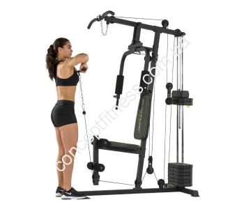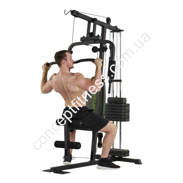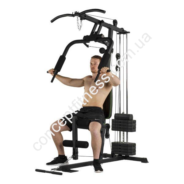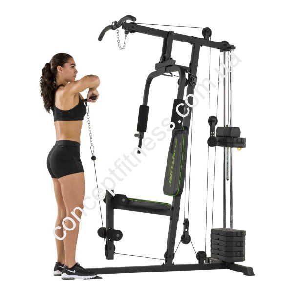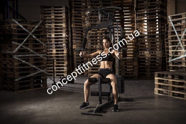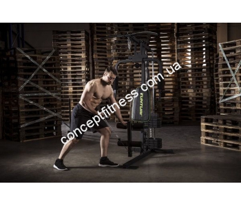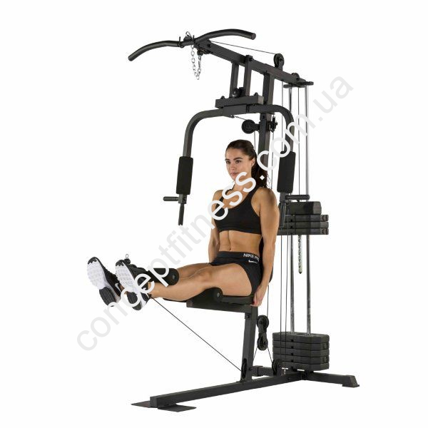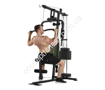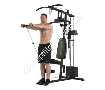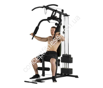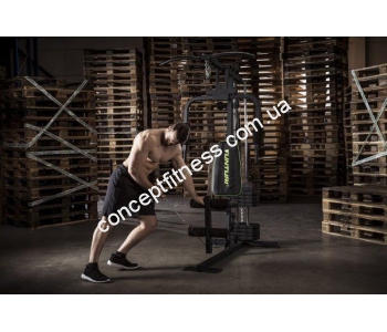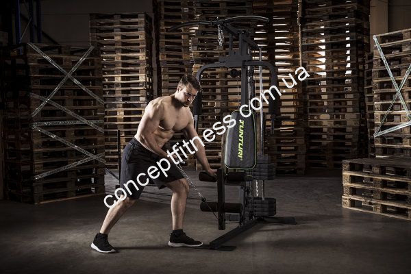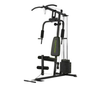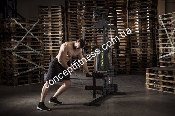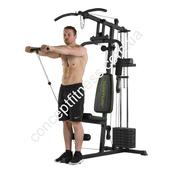 Фітнес станція Tunturi HG10 Home Gym, артикул 17TSHG1000 активно використовується в домашніх і зальних умовах. Всі металеві деталі ковзають плавно, без ривків і скрипів, передбачена швидка система регулювання. Міцні і широкі лямки для ніг зміцнять сідниці, внутрішню частину стегон, зроблять фігурку привабливіше. Товщина оббивки 6 см, укріплена з боків спеціальним матеріалом. Допустиме навантаження на раму 125 кг, а вага стека регулюється вручну і досягає 45 кг. На силовий станції можна здійснити вправи для преса, грудного і шийного відділу, прокачування м'язів рук і ніг. Тренажер оснащується верхнім блоком для тяги, незалежним батерфляєм, разгибателем для ніг. Широка і вузька ручка для тяг допоможуть новачкам і професійним атлетам.