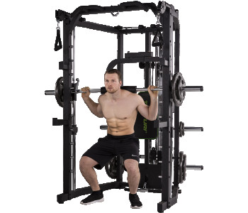 Міцна сталевa рама, система Сміт-машини, верхні та нижні блоки, можливість роботи з вільною штангою, турніком та багатофункціональною лавою роблять цей тренажер універсальним рішенням для силових тренувань вдома.
