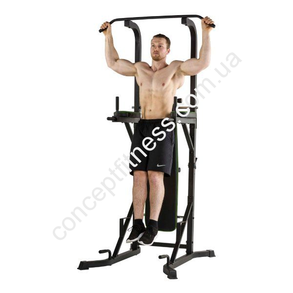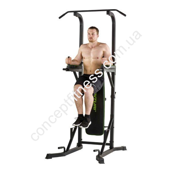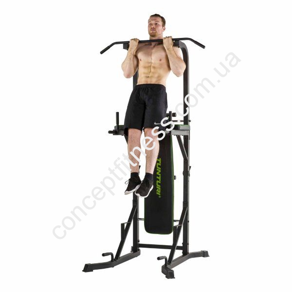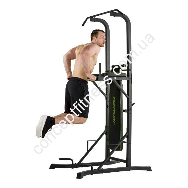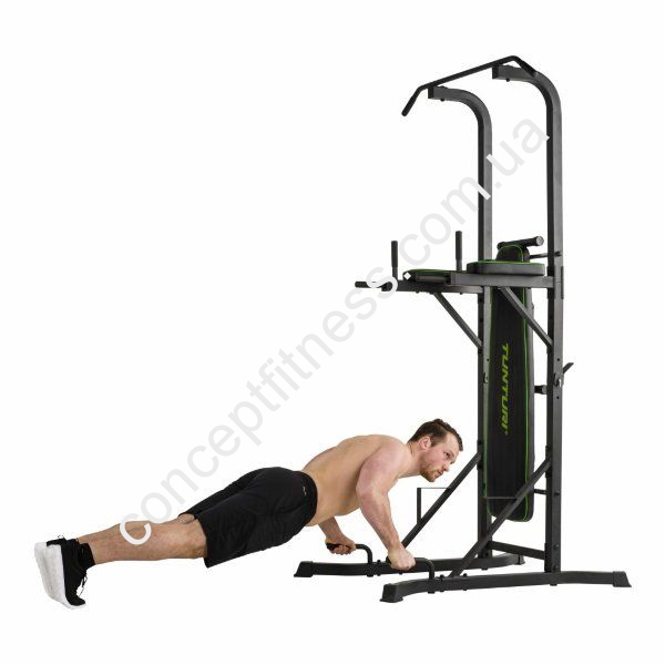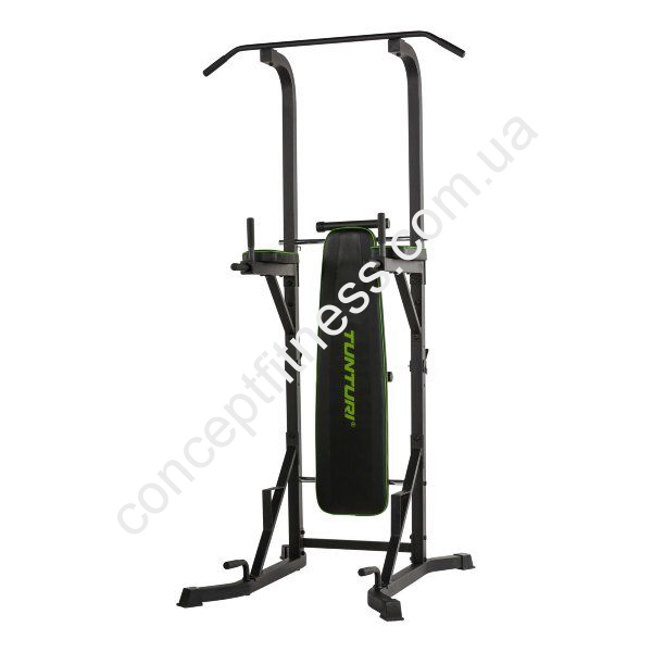 Спортивне спорядження для будинку Тунтурі, ПТ60 Пауер Тауер, арт.17TSPT6000 складається з турніка, лави для преса, брусів, упорів для рук, лаву для правильного жиму штанги і упор для систематичних віджимань. Щільна, але в міру м'яка оббивка, товщиною 6 см і потовщеними кутами надає ще більшої функціональності. Хват при підтягуванні можна змінювати, прокачувати трицепси і біцепси одночасно. Конструкція сталева, захищена від корозії, пофарбована порошковою фарбою. Завдяки упорів під лікті можна виконати махи ногами, прокачати прес.