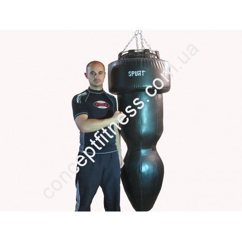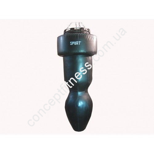 Снаряд у формі силуету спортсмена Спурт, СП-001, чорний підходить для відточування всіх видів ударів, за рахунок висоти і дизайну мішка. Наповнення не порошить, розраховане для регулярних тренувань без часу на перерви. Гарантія на мішок рік, що передбачає під собою витримування потужних ударів, розбіжність по швах, освіту надривів. Спеціальна конструкція мішка Spurt дозволяє не тільки наносити удари руками знизу-вгору, але і колінами і ногами. Загальна вага снаряда змінюється, тому він використовується в тренажерних і фітнес центрах, домашніх умовах. Мішок займається зміцненням рук, прес, ніг, стегон. Снаряд підходить для тренувань в домашніх і зальних умовах.