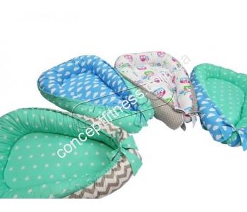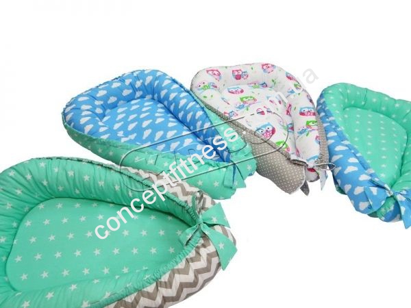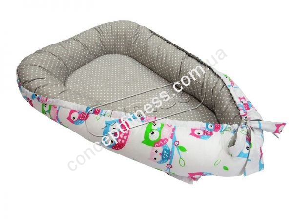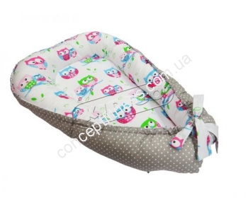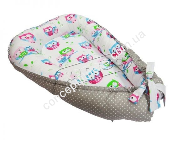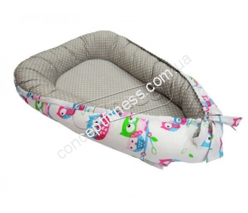 Кокон для новонароджених Kidigo (сови - горошок), артикул KN-2 зроблений з зносостійких, легких і якісних матеріалів. Матрацик виконаний з товстого поролону, а бортика наповнені гіпоалергенним матеріалом, холлофайбером. Кокон обтягнутий бавовняною тканиною, рекомендується прати в делікатному режимі, не вище 30 градусів. Аксесуар затребуваний серед молодих матусь, не вимагає особливого догляду.