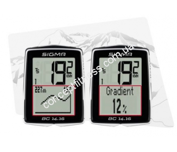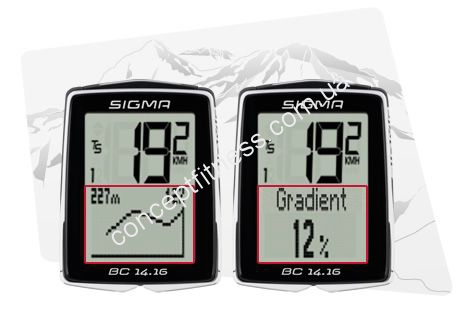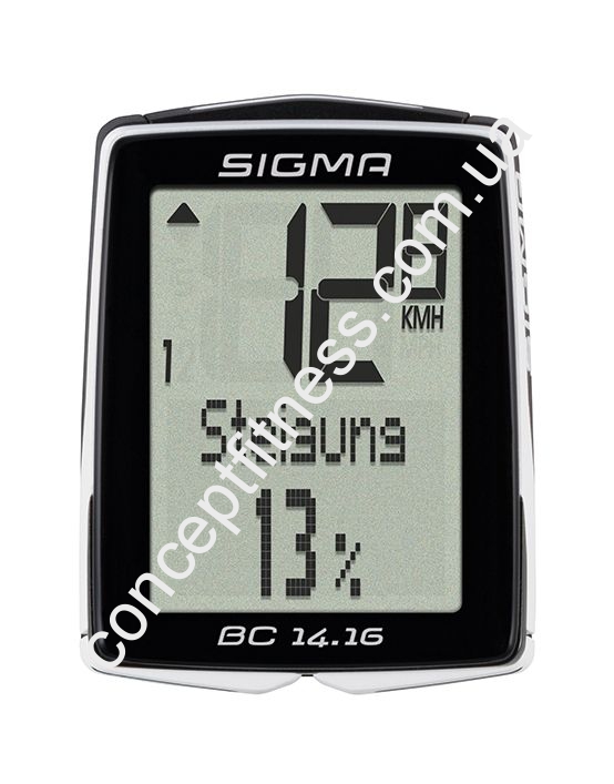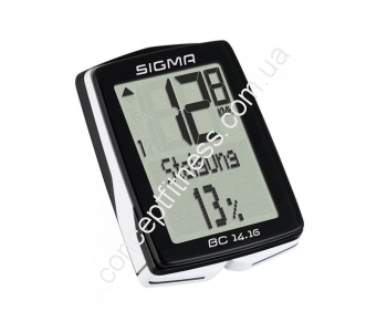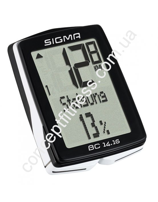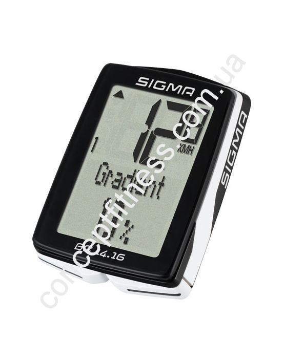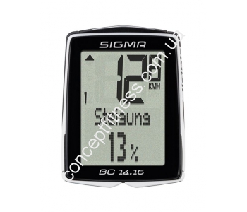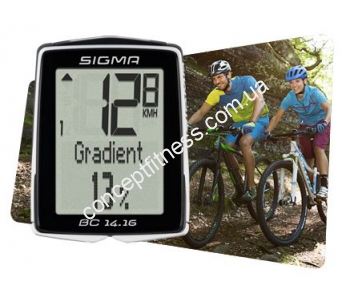 Велокомпьютер BC 14.16 Sigma Sport SD01416 до доповнення до стандартних функцій демонструє висоту над рівнем моря, відсоток нахилу спуску /підйому, пов'язує 2 байка в одне ціле, підганяє роботу під розмір колеса велика. Живлення приладу походить від невеликого елемента живлення, в кінці поїздки дані можна скинути на ноутбук. Модель славиться вбудованими функціями, таким чином, велосипедист зможе відстежити поточну, середню і максимальну швидкість, загальний пробіг, подолану дистанцію, поточний і загальний час поїздки. На приладі можна порівняти поточну і середню швидкість, підібрати розмір колеса і все це без проводів. Велосипедист може також сформувати статистику тренувань за 12 місяців.