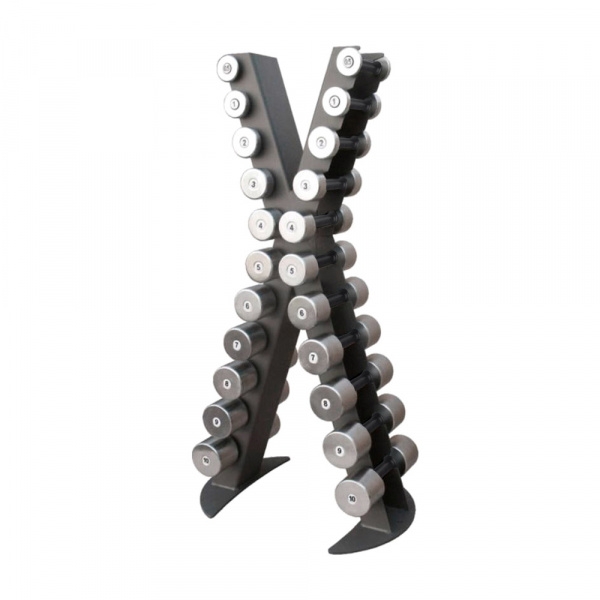 Конструкція допомагає економити місце, яке необхідно для зберігання спортивних снарядів. Спортивне устаткування оснащене вертикальної конструкцією, яка має спеціальні гнізда для 10 пар гантелей. Конструкція виготовлена у вигляді букви Х. Вона дуже зручна і є однією з найбільш компактних форм для зберігання гантелей.