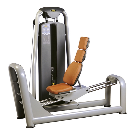 Жим ногами горизонтальний NRG N107 прокачує чотириглавий м'яз стегон, сідниці і ікри. Конструкція тренажера дозволяє максимально залучити до роботи квадріцепси, при цьому максимально ізолювати нижню частину тіла. Тренажер з 100 кг стеком встановлюється в спортивних установах і домашніх умовах. Амортизуючі гумові підп'ятники блокують ковзання тренажера по підлозі. На сталеву раму і шви передбачена довічна гарантія.