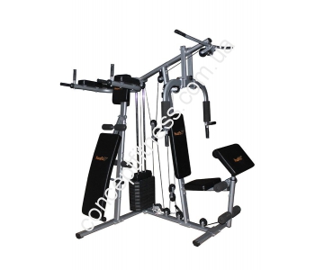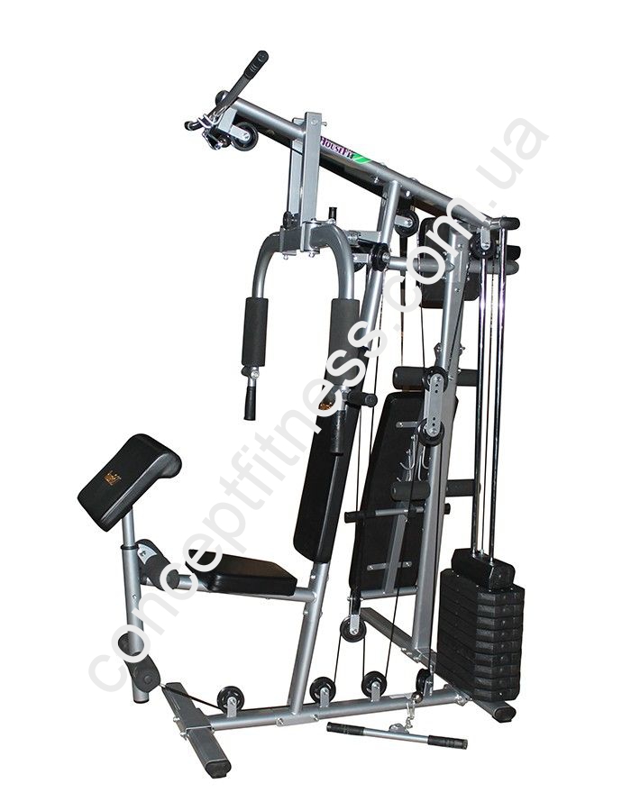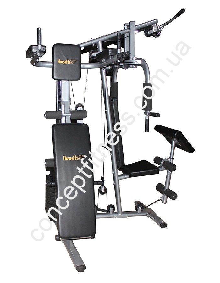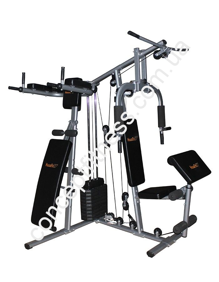 Вантажоблочний тренажер ХаузФіт, артикул DH 81715 оснащується брусами, регульованою лавою і приставкою Скота. Рама виконана з щільних, овальних конструкцій з стали, пофарбована порошковою фарбою. Комфортабельні спинка і сидіння не викликають втоми спини та попереку. Тренажер витримує 110 кг пользователя.