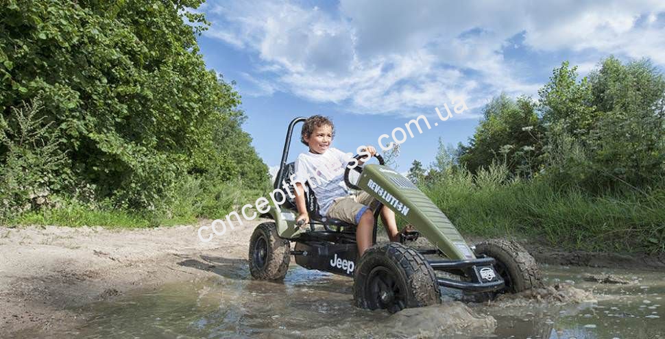 Універсальний транспорт для відпочинку на природі Берг Джип Революшін БФР-3, артикул 07.21.06.00 обладнаний всім необхідним для незабутніх пригод, включаючи решітку, логотип, ручним гальмом. Колеса мають прекрасну прохідністю, є найкращим засобом для пересування по лісовій місцевості. Такий велокар перетворить поїздки в справжнє сафарі. Наявність переднього спойлера поліпшить загальну аеродинаміку веломобіля. Модель з надувними колесами припаде до душі досвідченим і починаючим райдерам.