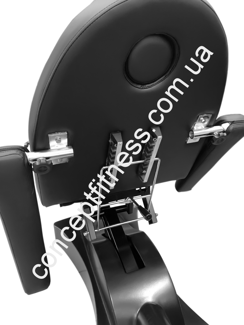 механічне регулювання висоти. 3 секції і роздільні ніжки. Регулювання спинної частини механічно крок за кроком горизонтально повністю розкладається. Кут нахилу ножної частини 90 градусів. Ножні секції подовжуються на 10 см. Підлокітники знімні, регулюються механічно. Основа крісла: метал. Оббивка: якісний кожзам PVC. глибина сидіння: 50 см