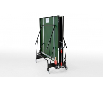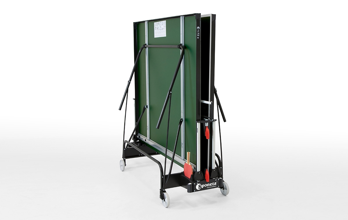 - Тенісний стіл базується на компактній зручній візку. Візок виготовлений з металевого трубчастого профілю діаметром 25 мм з поліефірним покриттям і оснащена незалежним складним механізмом.