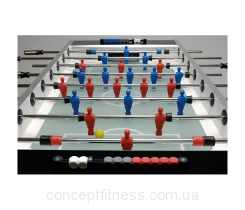 - - Ігрове поле із загартованого антиблікового шліфованого скла товщиною 5 мм із наклоном по периметру для запобігання виникненню "мертвих зон". Білі лінії на зеленому тлі нанесені методом шовкографії, відтворюючи футбольне поле.