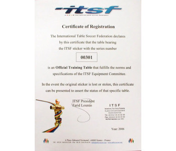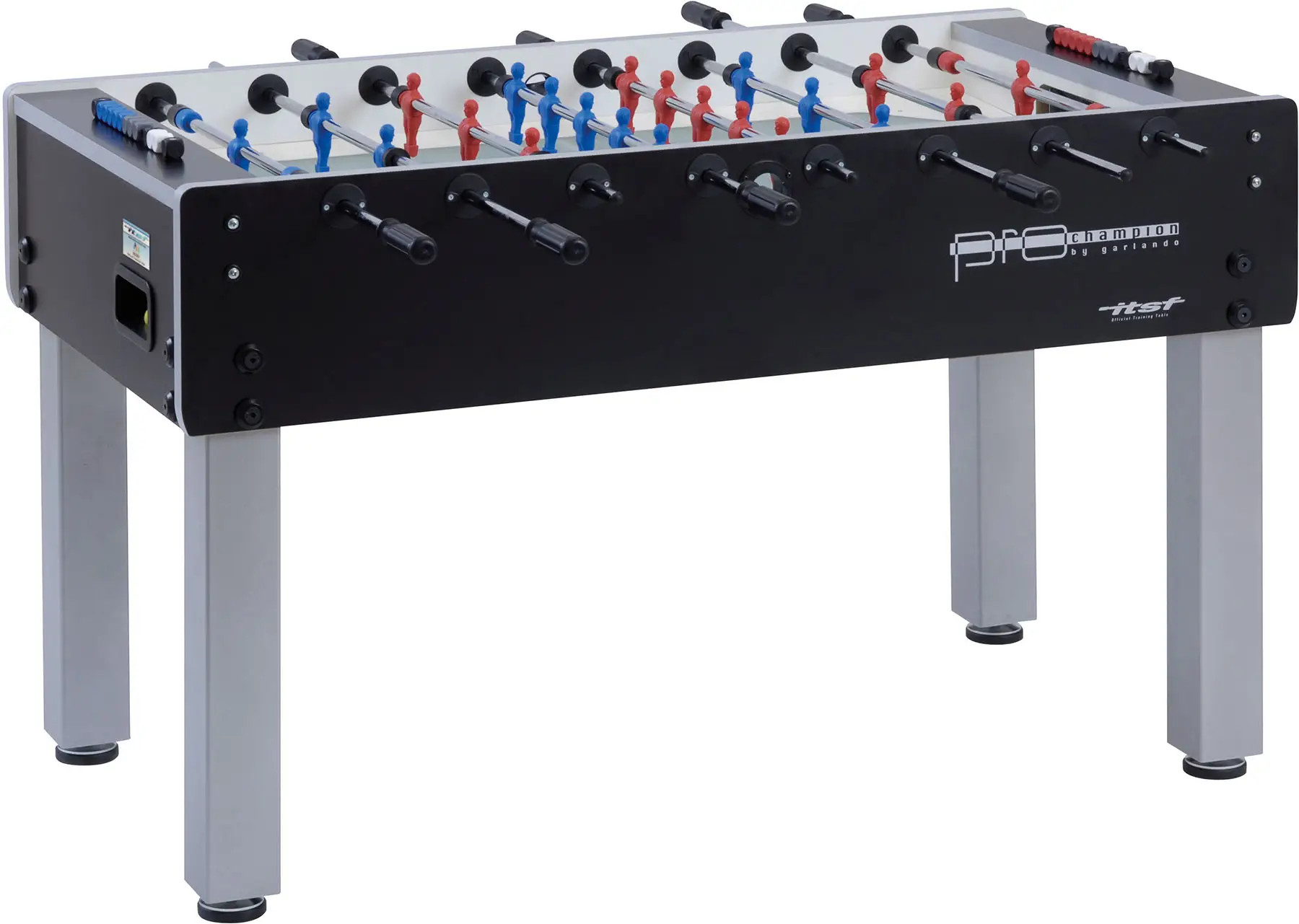 Настільний футбол Garlando Pro Champion ITSF (PRO) - офіційний стіл Міжнародної федерації настільного футболу ITSF, призначений для тренувань професійних гравців і змагань Pro Tour. Міцна конструкція стола має елегантне поєднання чорного та сріблястого кольорів, натхненного стилем хай-тек. Модель виготовлена безпосередньо в Італії з високоякісних матеріалів, що забезпечують довговічність і задоволення від гри, з урахуванням конкретних вимог, яким повинен відповідати футбольний стіл. Настільний футбол Garlando Pro Champion ITSF (PRO) відповідає європейським стандартам безпеки EN 71-1, 71-2, 71-3 та 71-9.