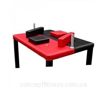 Стіл для армрестлінгу Marbo Sport MC-T001 зручне обладнання, яке використовується в професійних спортивних клубах для підготовки спортсменів перед професійними змаганнями. Стільниця покрита м'якою оббивкою в двох кольорах ndash; чорний і червоний ndash; що розділяє її на дві зони. Також присутні кілька м'яких блоків, які використовуються під час тренувань і укладаються під руки спортсменів. Стіл для армрестлінгу Марбо Спорт MC-T001 оснащується двома ручками, за які спортсмени можуть триматися вільною рукою. Надійна і стійка рама столу є основою його конструкції і забезпечує тривалий період експлуатації.