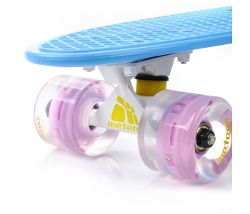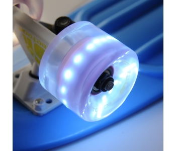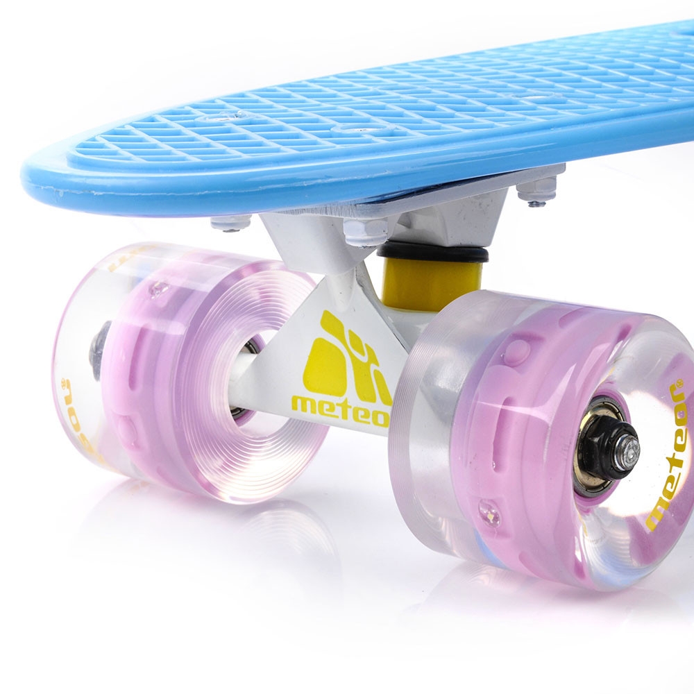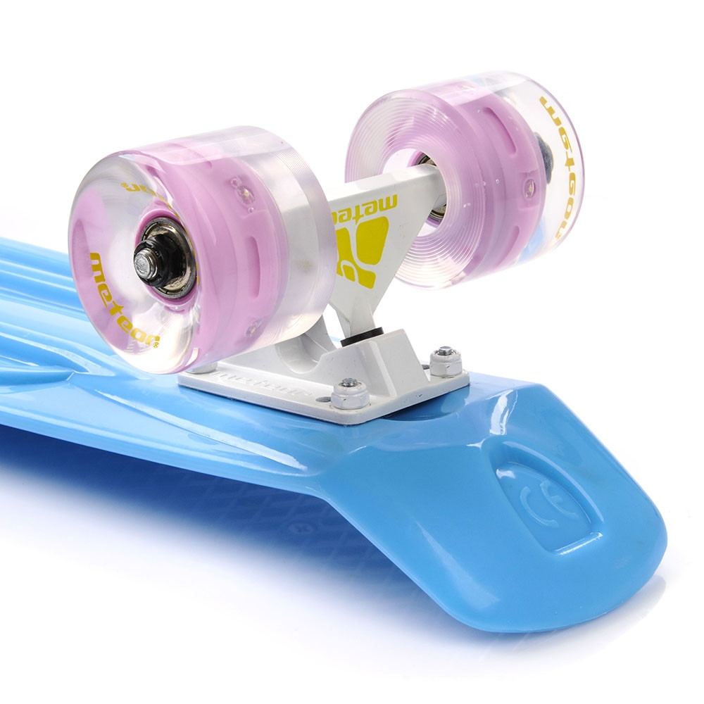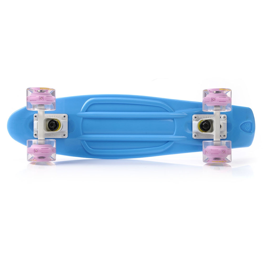 Скейтборд Meteor LED 23898 /LED /blue можна назвати незвичайною моделлю скейтборду, яка стане ідеальним подарунком не тільки для дітей, але і підлітків, і яку зможуть по достоїнству оцінити маленькі користувачі. Представлене обладнання можна назвати також і ідеальним способом пересування по місту, оскільки широкі в діаметрі коліщатка такої моделі скейта здатні подолати практично будь-яку перешкоду. А завдяки матеріалу, з якого вони створені, колеса не будуть занадто швидко стиратися, не вимагаючи частої заміни даного елемента. Скейтборд Метеор ЛЕД 23898 /ЛЕД /блу є володарем зносостійкого деки з посиленого пластику, що дозволяє скейтборду витримувати падіння, стрибки і більшість інших механічних навантажень. Вигнута задня частина і сама форма деки робить представлене обладнання більш маневреним і дозволяє маленькому райдеру практикувати різноманітні трюки.