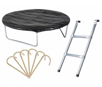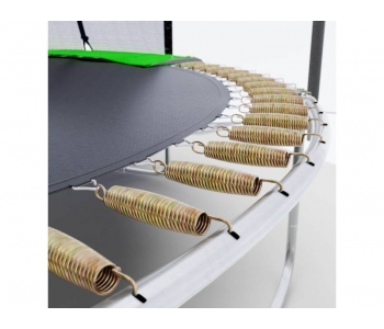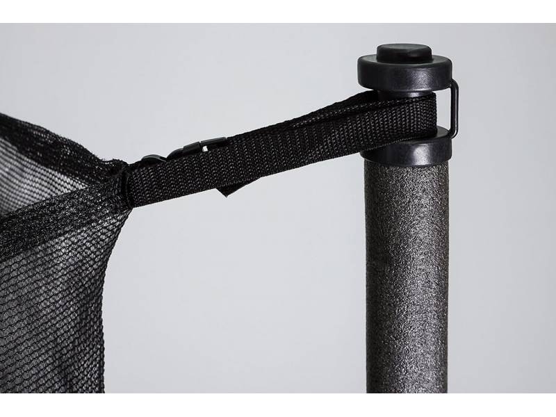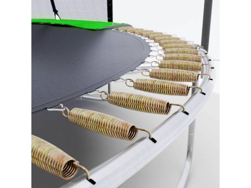 Особливість конструкції - внутрішнє розташування сітки - допомагає захистити пружини від випадкових пошкоджень і продовжити термін їх служби. Поліпропіленове стрибкових полотно відрізняється стійкістю до великих вантажів, вологості і сонячного випромінювання. Також для зручності батут оснащений хромованою сходами і захисним полотном від дощу. Батут можна легко розмістити у дворі, гаражі або будинку.