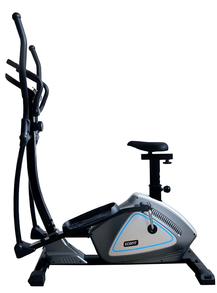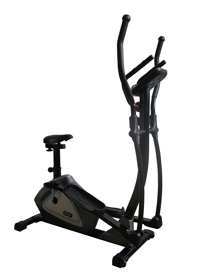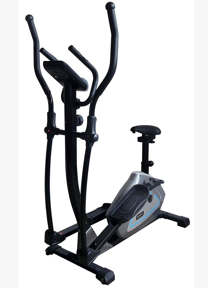 Орбитрек Ecofit E-607EA з магнітною системою навантаження і сидінням. Призначений для тренування серцево-судинної і дихальної систем, тренування м'язів ніг і всього тіла. Хід з навантаженням в прямому і зворотному напрямку. Датчик вимірювання пульсу на нерухомій рукоятці. Подвійний хід рукояток для тренування верхньої частини тіла. Сидіння регульоване як по вертикалі так і по горизонталі. Функції компьтера: пульс, час, дистанція, швидкість, калорії, режим сканування. Автоматичне вимкнення тренажера.