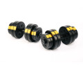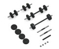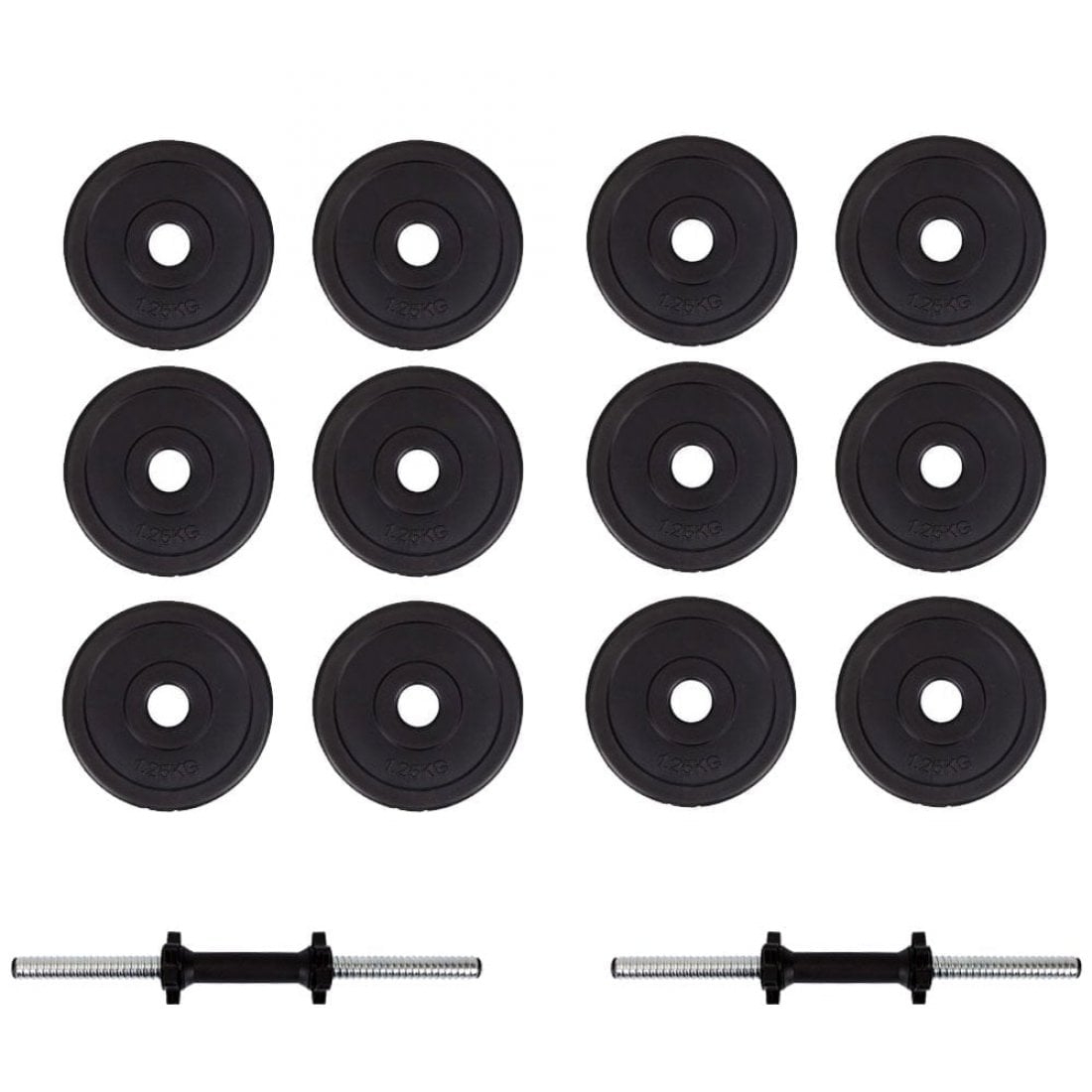 Диски покриті декількома шарами пластику, який забезпечує захист підлог, панелей, плиток при падінні гантелі. У набір входить також солідний прямий гриф з гвинтовими клемами, загальною довжиною 45 cм. Ключовими елементами грифа є гвинтові закінчення і клеми, рифлені рукоятки - ці елементи покращують кожне тренування.