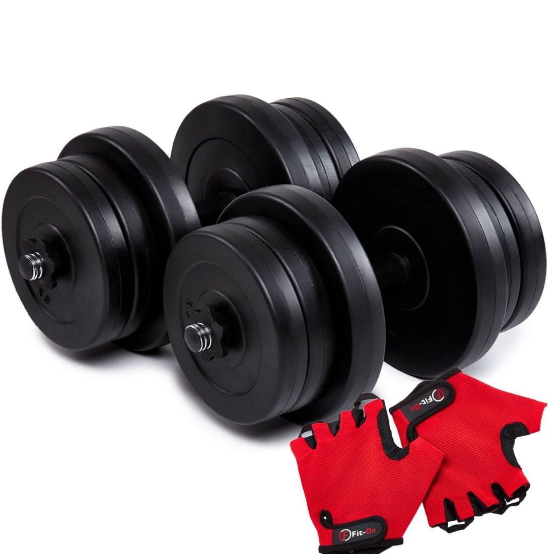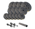 Диски покриті декількома шарами пластику, який забезпечує захист підлог, панелей, плиток при падінні гантелі. У набір входить також солідний прямий гриф з гвинтовими клемами, загальною довжиною 45 cм. Ключовими елементами грифа є гвинтові закінчення і клеми, рифлені рукоятки - ці елементи покращують кожне тренування.