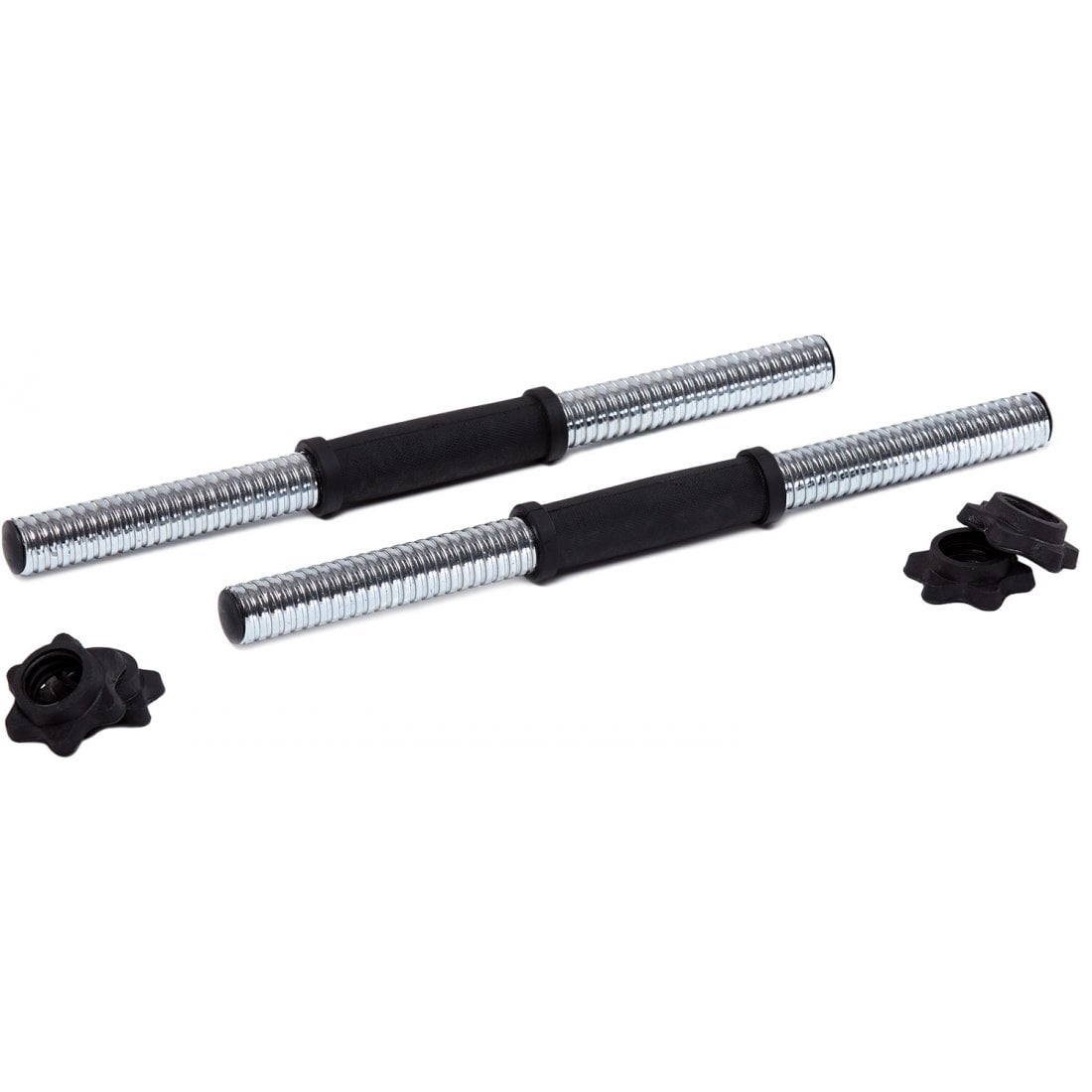 Диски покриті декількома шарами пластику, який забезпечує захист підлог, панелей, плиток при падінні гантелі. У набір входить також солідний прямий гриф з гвинтовими клемами, загальною довжиною 45 cм. Ключовими елементами грифа є гвинтові закінчення і клеми, рифлені рукоятки - ці елементи покращують кожне тренування.