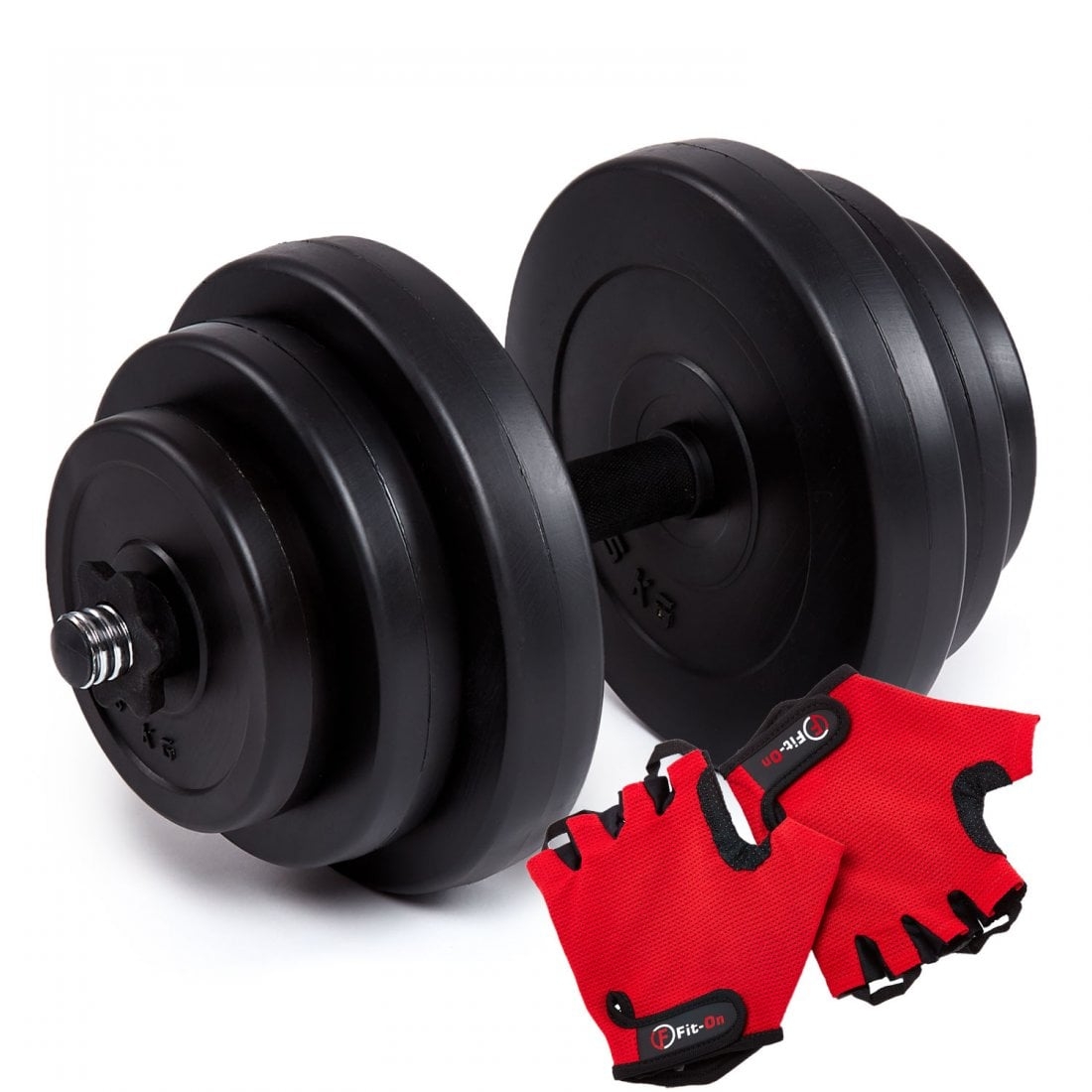 Диски покриті декількома шарами пластику, який забезпечує захист підлог, панелей, плиток при падінні гантелі. У набір входить також солідний прямий гриф з гвинтовими клемами, загальною довжиною 45 cм. Ключовими елементами грифа є гвинтові закінчення і клеми, рифлені рукоятки - ці елементи покращують кожне тренування.