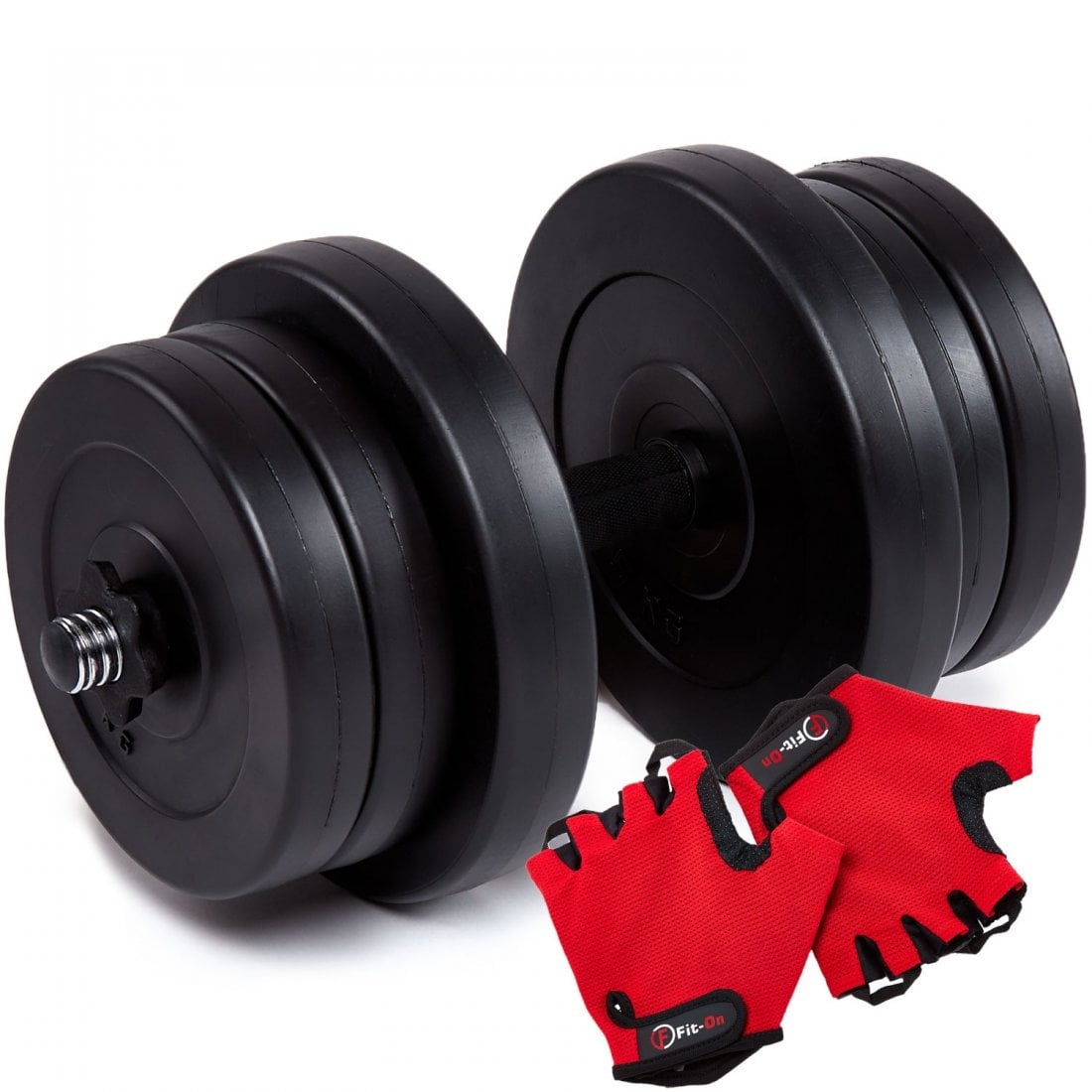 Диски покриті декількома шарами пластику, який забезпечує захист підлог, панелей, плиток при падінні гантелі. У набір входить також солідний прямий гриф з гвинтовими клемами, загальною довжиною 45 cм. Ключовими елементами грифа є гвинтові закінчення і клеми, рифлені рукоятки - ці елементи покращують кожне тренування.