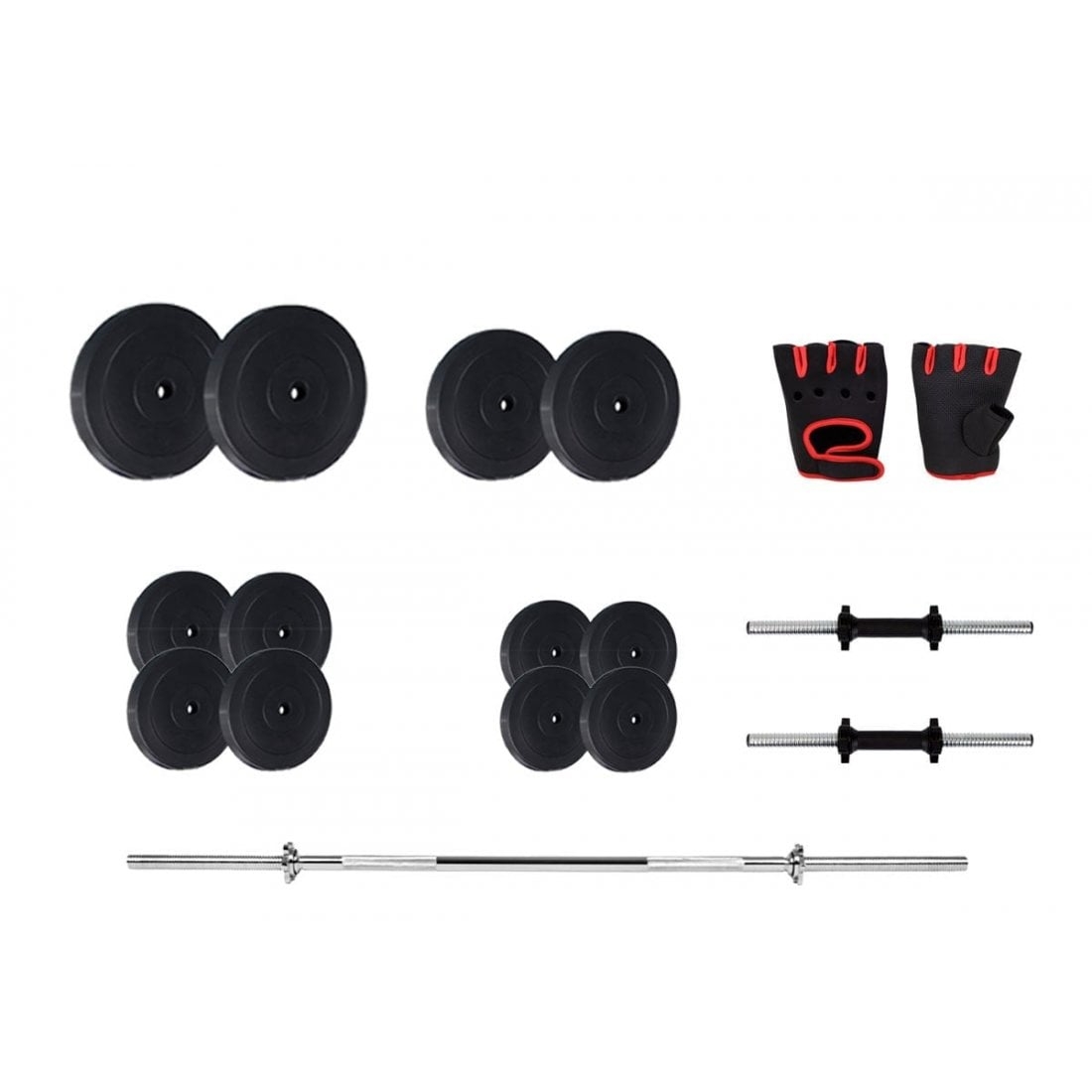 У комплект входить гриф прямої довжиною 120 см з діаметром 30 мм, два коротких гантельних грифа, рукавички і диски. Загальна вага становить 52 кг.