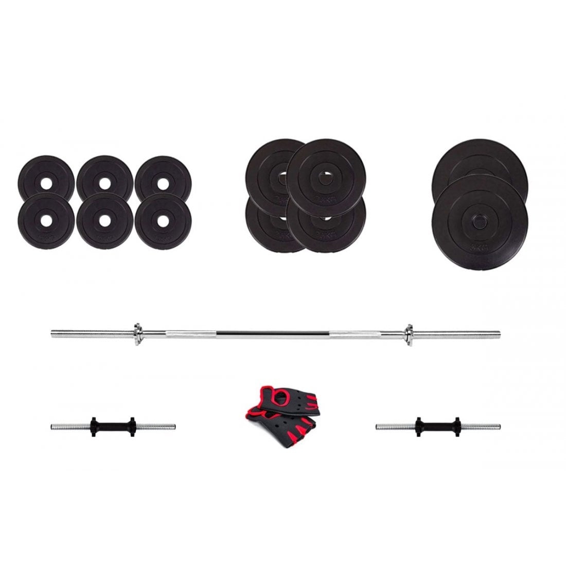У комплект входить гриф прямої довжиною 180 см з діаметром 30 мм, 2 гантельних грифа, рукавички і диски. Загальна вага становить 39,5 кг.