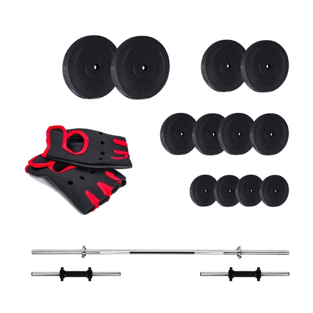 У комплект входить гриф прямої довжиною 180 см з діаметром 30 мм, 2 гантельних грифа, рукавички і диски. Загальна вага становить 57 кг.