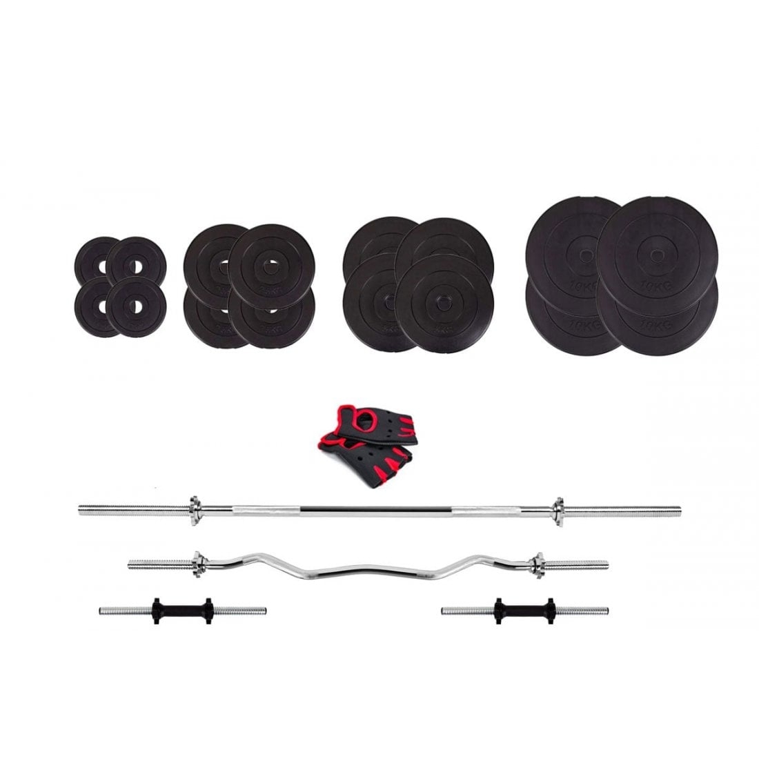 У комплект входить гриф прямої довжиною 180 см з діаметром 30 мм, гриф W-подібний, 2 гантельних грифа, рукавички і диски. Загальна вага становить 95 кг.