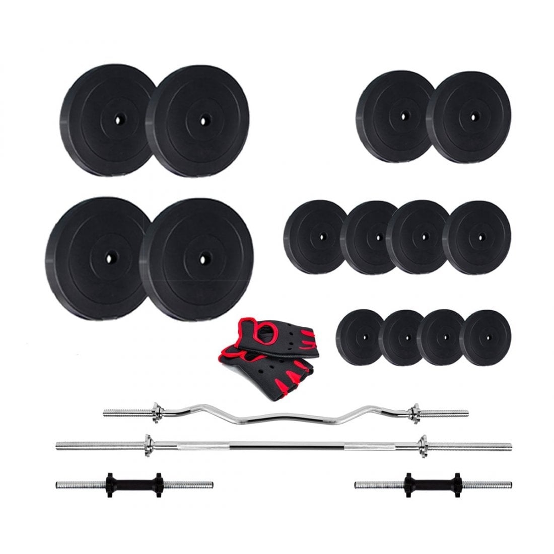 У комплект входить гриф прямої довжиною 180 см з діаметром 30 мм, гриф W-подібний, 2 гантельних грифа, рукавички і диски. Загальна вага становить 72,5 кг.