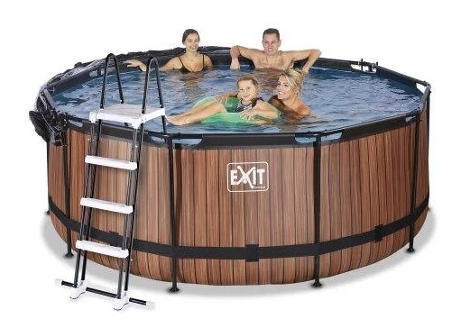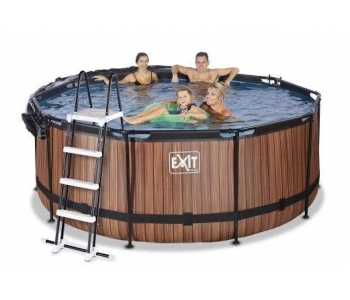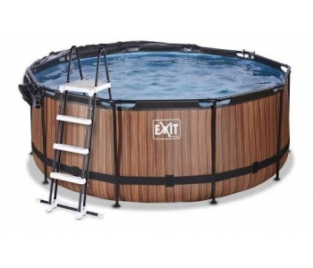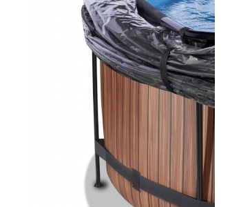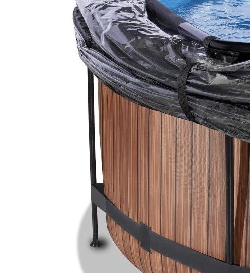 Басейн круглий з куполом EXIT дерево 360х122 см виглядає лаконічно і елегантно. Із зовнішнього боку - тканину із забарвленням у вигляді дерев'яної стіни, що зробить його розміщення в саду, на дачі або у дворі будинку особливо естетичним.