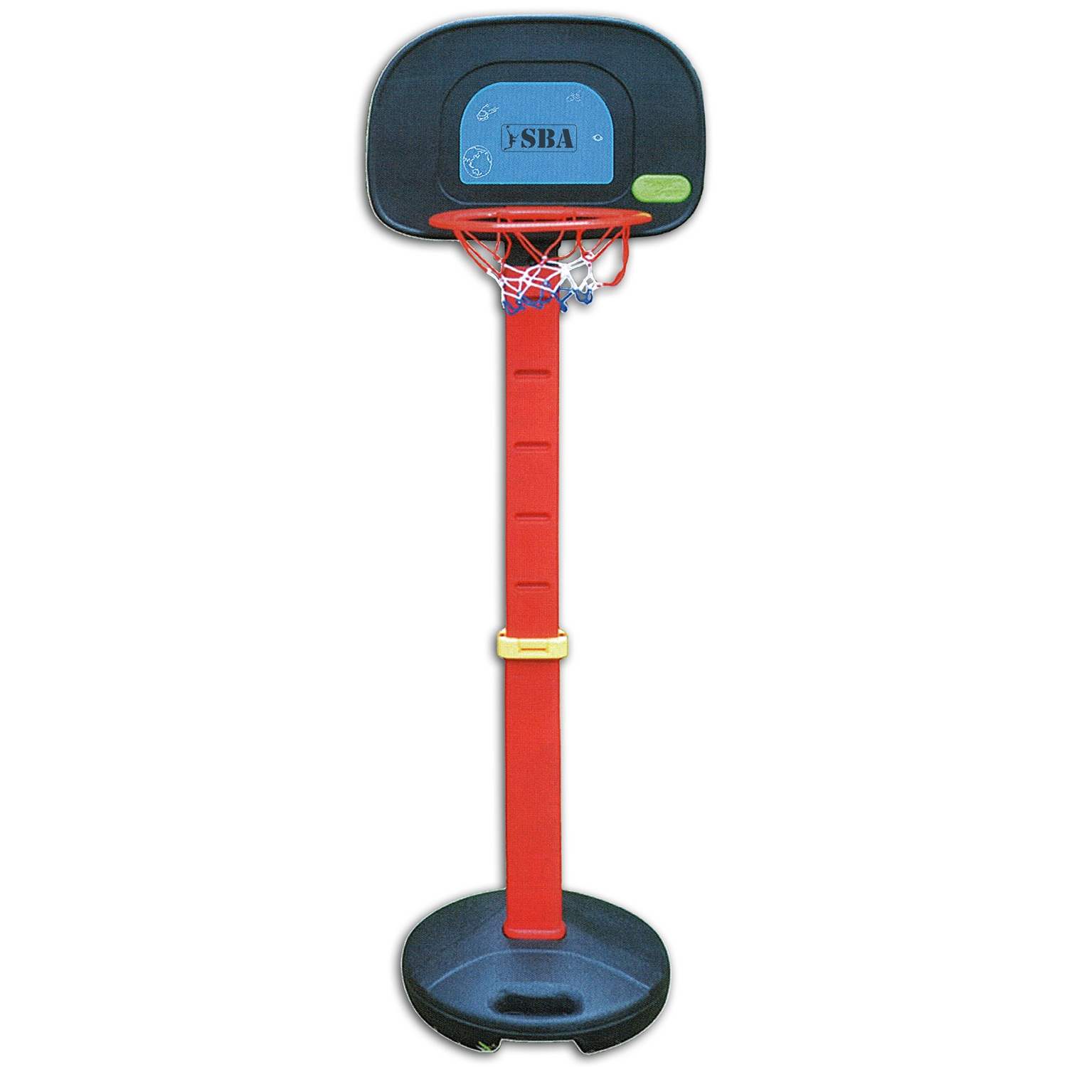 Баскетбольна стійка SBA S881В дитяча 40x28 см призначена для знайомства дітей з основними правилами і прийомами гри в баскетбол. Стійка і щит виконані з високоякісного пластику. На щиті стійки закріплено кільце. Стійка відповідає всім необхідним вимогам, що пред'являються до спортивного інвентарю цього класу. Стійка регулюється по висоті.
