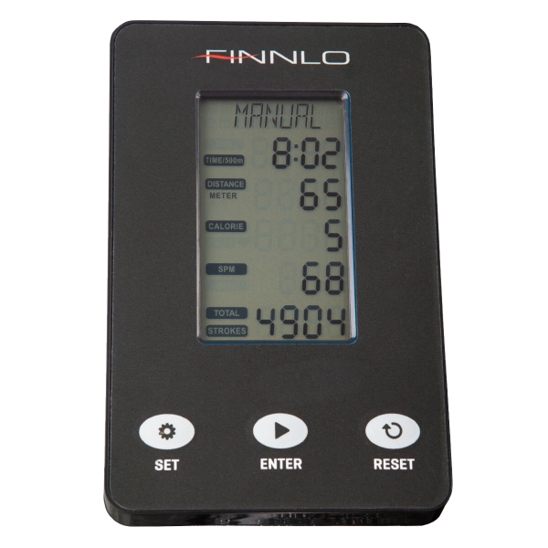 Зручний ЖК-дисплей на бортовому тренувальному комп'ютері з індикатором потужності. ЖК-дисплей бортового тренувального комп'ютера FINNLO Aquon Water Glide миттєво відображає всі ваші ключові дані під час веслування. Він відображає інформацію, таку як час, який ви тренувалися, ваше середній час на 500 м, пройдену відстань, витрачені калорії, частота серцевих скорочень, кількість гребків в хвилину, потужність гребка і загальна кількість гребків під час вашої поточної тренування. Комп'ютер має три програми на вибір для вашої індивідуальної тренування: РУЧНАЯ - негайний запуск: всі функції просто починають відлік з нуля або відображають поточні значення. Інтервал - тільки для налаштувань часу: Ви можете вибирати між встановленими або призначеними для користувача інтервалами вправ /відпочинку. Ви також можете зберегти ці значення. TARGET - кілька функцій: дозволяє встановити частоти серцевих скорочень, калорій, відстані або часу. Бортовий тренувальний комп'ютер працює від батареї, а інтуїтивно зрозуміле меню і три кнопки роблять користування комп'ютером зручним для користувачів будь-якого віку. Комп'ютер тренажера оснащений функцією автозапуску, що означає, що він запуститься, як тільки ви почнете гребти. Сконцентруйтеся на тренуваннях з веслування! Комп'ютер гребного тренажера може відображати частоту вашого пульсу за допомогою додаткового нагрудного ременя (продається окремо). Тренування, орієнтовані на серцевий ритм, допоможуть вам швидше досягти поставлених цілей: тренування на витривалість, тренування серцево-судинної системи або зниження ваги. Ваш серцевий ритм є ключем! Використовуйте додатковий нагрудний ремінь для вимірювання частоти серцевих скорочень. Таким чином, ви завжди можете уважно стежити за частотою свого пульсу.