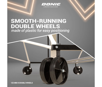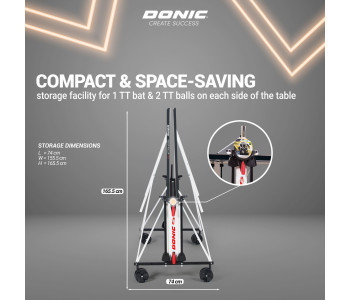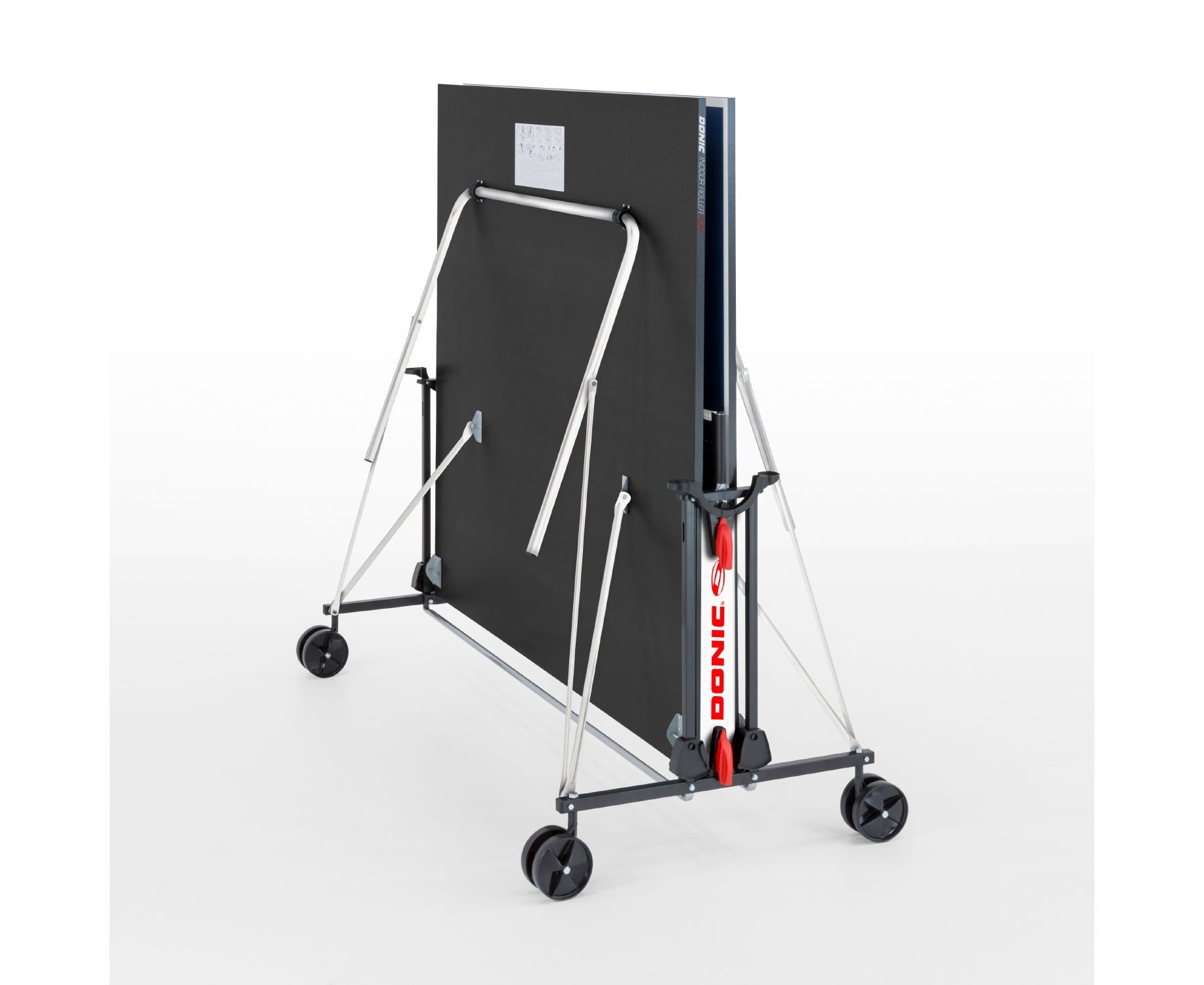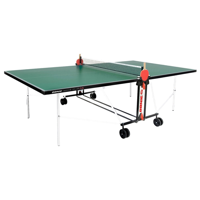 Стіл для настільного тенісу Donic Indoor Roller FUN - міцний компактний, складний тенісний стіл для аматорської гри у ping pong у закритих приміщеннях. В основі столу розташовані осередки для зберігання ракеток та м'ячів