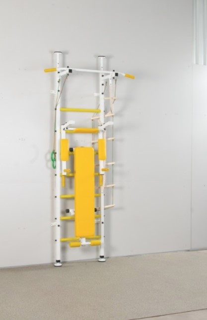 Стійка quot; Юнга yellowquot; (Шведська стінка з металевими перекладінамі з пластиковим покриттям, турнік з широким хватом, мотузкові сходи, канат, кільця, лавка quot; прессаquot ;, бруси). У жовтому кольорі