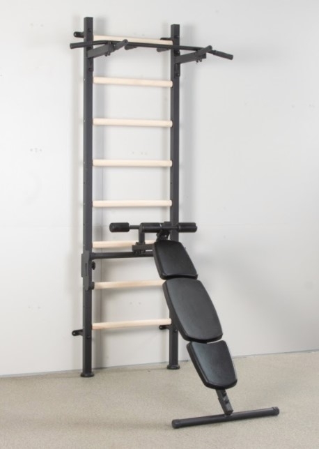 Шведська стінка quot; Master Wood PROquot; посилена з дерев'яними перекладинами, жорстко закріпленим турніком, знімними брусами, знімною поліуретанової лавкою, розділеної на кілька частин, що дозволяє витримувати підвищене навантаження, а також використовуватися в спортивних залах. Спирається навісних елементів відбувається на кріплення, встановлені на металевих стійках. Кріпиться до стіни. Кольори: чорний /білий