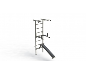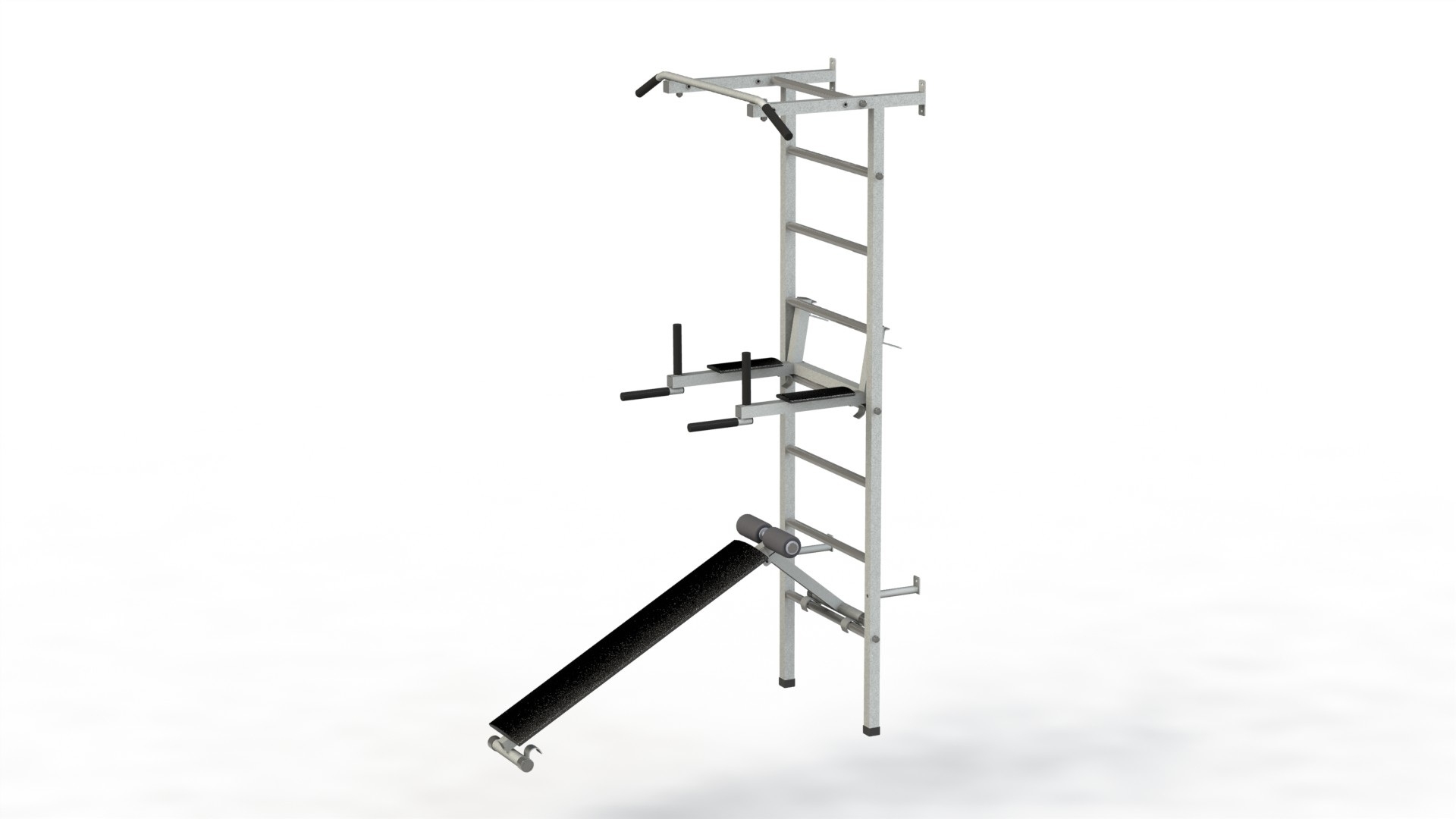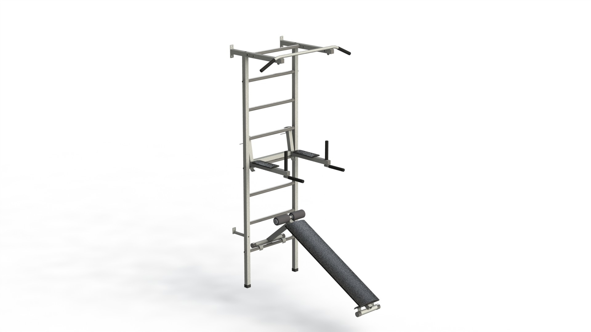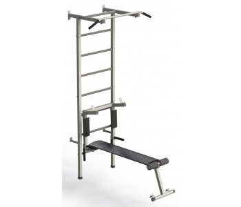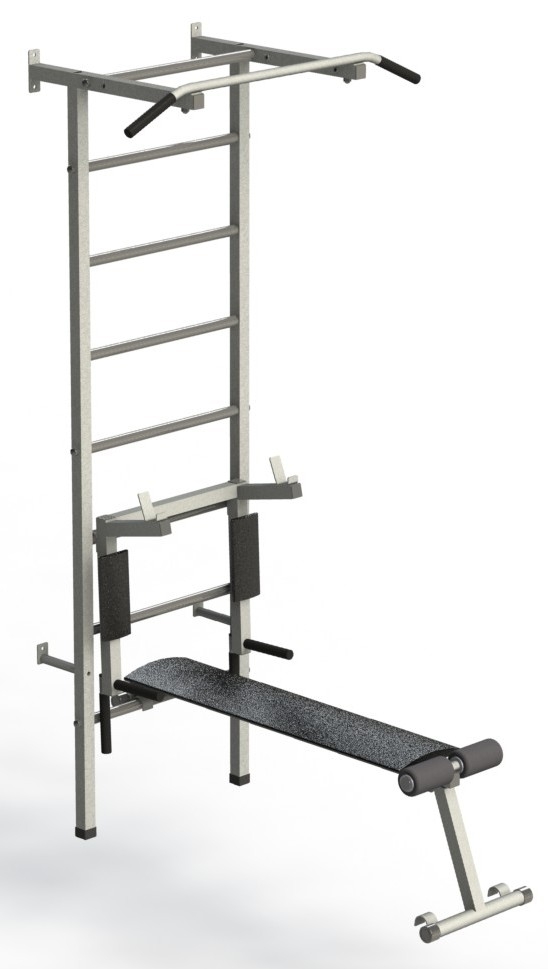 Тренажер для використання на дому або в офісі. Основне призначення шведської стінки це розтяжка, витягування і зняття навантаження з хребта. Шведська стінка доповнена турніком з широким хватом і надає можливість додатково займатися прокачуванням біцепса, трицепса, грудних і плечових м'язів. Модель укомплектована перенавесним турніком ndash; брусами та лавою для преса, жиму лежачи і сидячи. Якість виготовлення виробу на нашому заводі дозволяє проводити регулярні інтенсивні тренування роками.