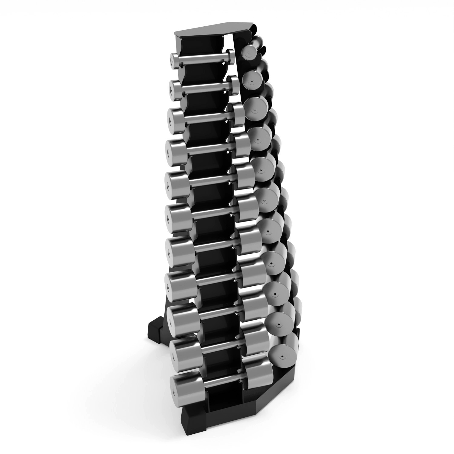 Стійки для гантелей значно економлять місце в приміщенні тренажерного зала. Вони допомагають тримати в порядку і швидкому доступі набір гантелей, які задіюються при великій кількості вправ як початківцями спортсменами, так і майстрами. Дане спортивне обладнання призначене для зберігання гантелей попарно, починаючи від 0,5 кг далі 1кг, 2кг і так до 10кг. Спортивне устаткування має вертикальну конструкцію, зі спеціальними гніздами для розміщення 11 пар гантелей. Стійка компактна і ергономічна при цьому оснащена міцною сталевою рамою. Виготовляється з товстостінного металу, підстава зроблено з профілю 60 х 80 х 3 мм. Конструкція стійки забезпечує компактну фіксацію гантелей. Стійка має стійку і продуману конструкцію. Набір хромованих гантелей має насічки на рукоятці, які виключають можливість ковзання рук. Завдяки чому виконання вправ стає більш безпечним і комфортним. На кожній гантелі нанесено маркування ваги.