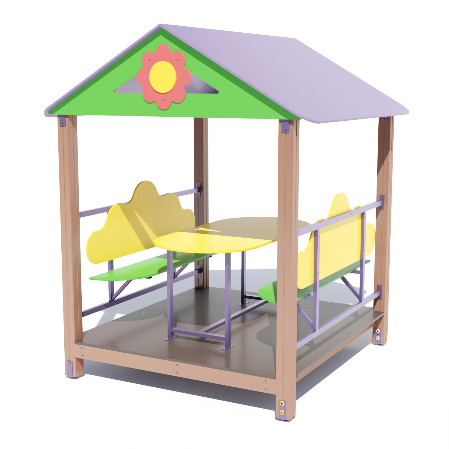 Усередині будиночка є 2 лавочки з фанери, розташовані уздовж стінок, що дозволяє дітям відпочивати в перервах між іграми на дитячому майданчику. Так само між лавочками встановлений столик, який дозволяє в будиночку малювати, обідати і навіть робити уроки. Має подвійні фанерну дах, яка чудово захищає дітей від променів сонця.