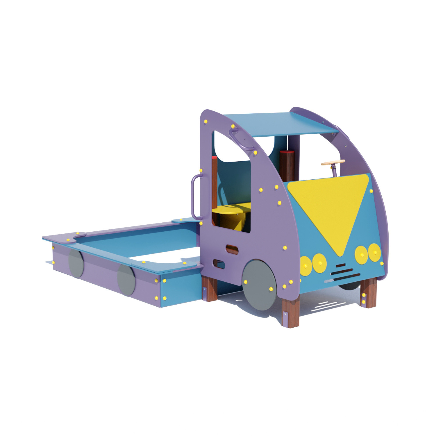 Крім самої пісочниці, в комплект входить кабіна з фанери, в якому розмістилася крамничка з фанери і один кермо. Кабіна встановлена на 4-х дерев'яних балках, завдяки яким можна регулювати висоту підлоги в кабіні (встановити на расчісченую дитячий майданчик або закопати ніжки в землю). Вся конструкція виконана з влагоустойчевой фанери.
