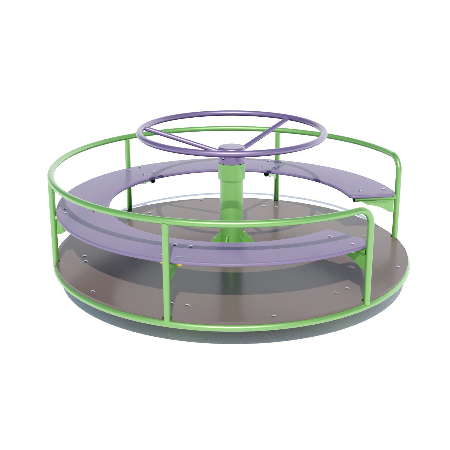 Головною особливістю цієї каруселі є С-образна лавка, виконана з влагоустойчевой фанери, яка буде служити Вам довгі роки. Поручень являє собою коло, який встановлений на металевій балці, який розташований посередині каруселі. Поручень і сама конструкція виконана з металу.