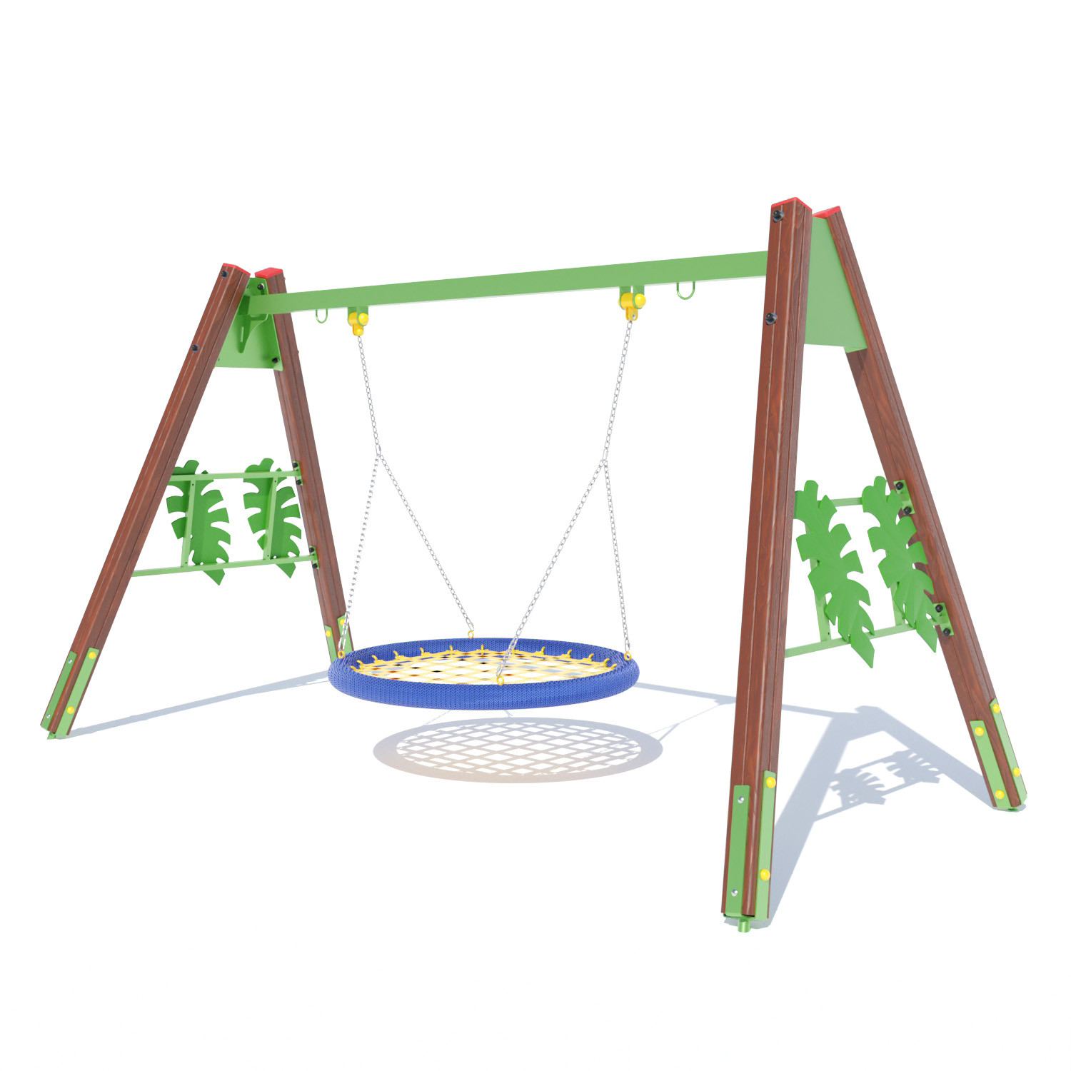 Гойдалка допоможе Вашій дитині зміцнити м'язову систему, вдосконалити відчуття рівноваги і розвинути комунікабельність. Особливістю цієї гойдалки є люлька, встановлена замість сидіння. Вона являє собою металевий круг, всередині якого натягнута павутинка з міцних мотузок. Сама люлька важить на металевих ланцюгах. Сама конструкція гойдалки виконана з дерева. З боків конструкції з зовнішньої сторони встановлені декоративні вставки з фанери в формі листя з джунглів.
