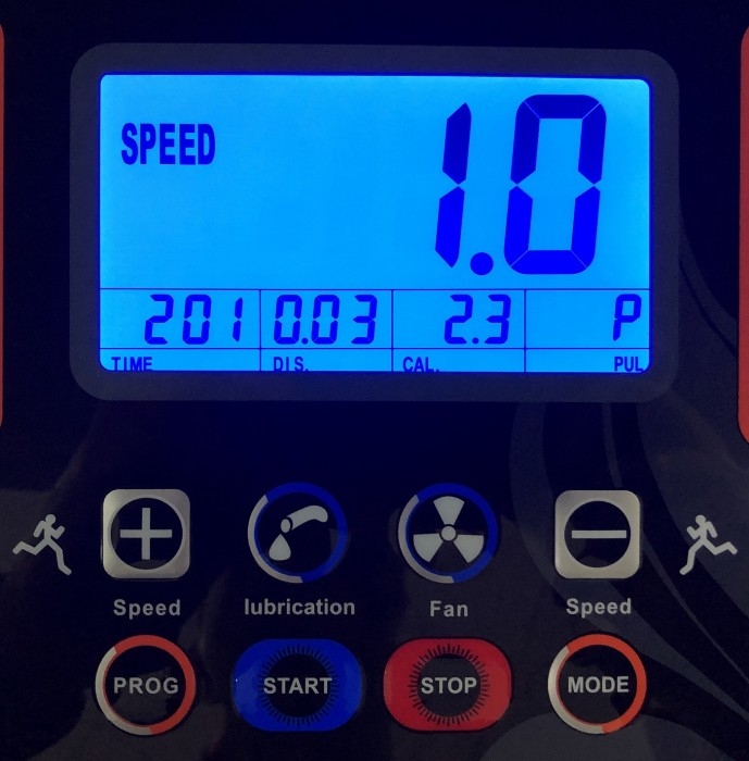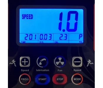 - - Рідкокристалічний 5-и дюймовий дисплей з блакитною підсвіткою, що відображає наступні параметри: час тренування, пройдена дистанція, швидкість, кут нахилу, витрата калорій, пульс