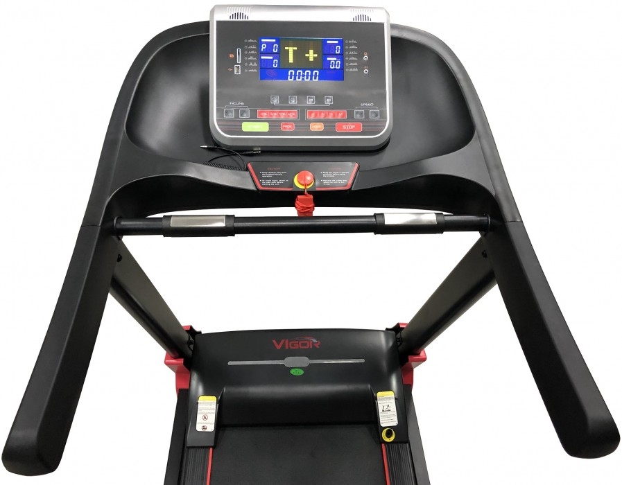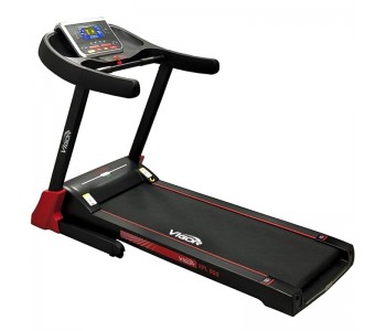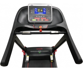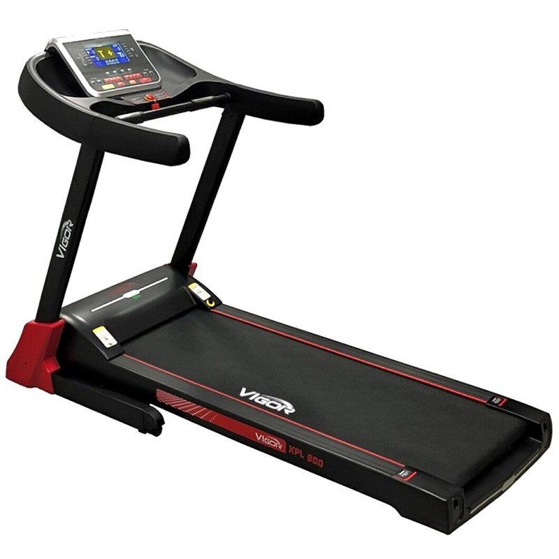 Бігова доріжка Vigor XPL800-топова модель бігового кардіотренажера. Дана модель відрізняється більш високими характеристиками і поліпшеними параметрами, такими як велика Допустиме навантаження, потужність мотора, розміри бігового полотна, краща амортизація. Доріжку від молодших моделей відрізняє наявність системи електронного регулювання кута нахилу полотна в діапазоні 0-15%, а також електродвигун потужністю в 3 к.с. (пікова 4 к. с.). Завдяки посиленій сталевій рамі доріжка з легкістю витримує спортсменів вагою до 130 кг. Наявність просунутої системи амортизації Dual-Cushion System значно послаблює ударне навантаження на суглоби, завдяки чому тренажер вийшов дуже комфортним і безпечним. Управляється бігова доріжка сенсорними кнопками, розташованими на лицьовій стороні консолі, а для зручності контролю за рівнем швидкості і кутом нахилу в поручні інтегровані додаткові кнопки швидкого доступу. Там же розташований двоколірний 7 " LCD дисплей з синім підсвічуванням, на якому відображається інформація про поточну швидкості руху, кількості витрачених калорій, обраній програмі, пройденій відстані, рівні серцевих скорочень. 12 вбудованих тренувальних програм і одна призначена для користувача дають можливість без проблем підібрати індивідуальний план тренувань. Для того що б урізноманітнити нудні вправи, в консоль вбудована пара стереодинаміків з можливістю підключення вашого смартфона, планшета або МР3 плеєра через інтерфейс AUX. Для зручності зберігання є можливість складання шляхом підйому бігового полотна, а для легкого переміщення до місця тренування в передній стійці є пара транспортувальних роликів.