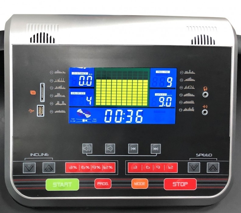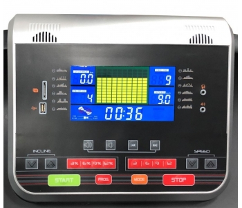 - рідкокристалічний 7-дюймовий дисплей з блакитним підсвічуванням, що відображає наступні параметри: час тренування, пройдена дистанція, швидкість, кут нахилу, витрата калорій, пульс