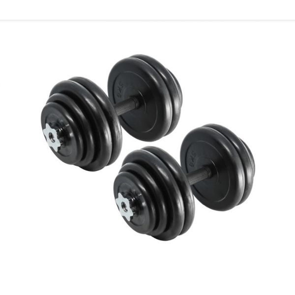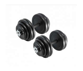 Загальна вага набору, що включає дві однакові гантелі, становить 39 кг. В основі кожного виробу лежить стильна хромована ручка-гриф із рельєфною поверхнею, яка забезпечує відмінне зчеплення снаряда з рукою. Що стосується дисків, вони мають вінілове покриття, що захищає підлогу від подряпин. Гантелі оснащені ручкою зі спеціальними насічками. Вона зручно лягає в руку, а завдяки насічкам не вислизає з хвату, що забезпечує безпеку при виконанні вправ. Діаметр ручки по краях дорівнює двадцяти шести міліметрів. А вантажні диски надійно закріплені, тому не зісковзуватимуть.