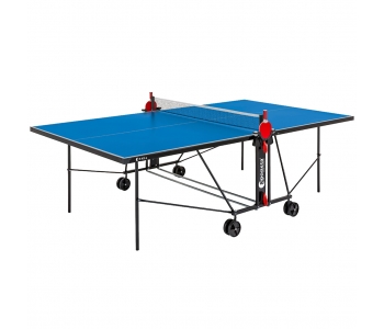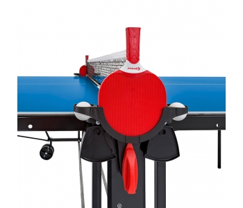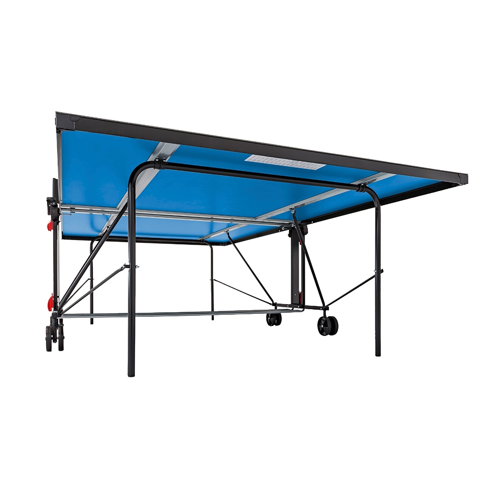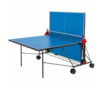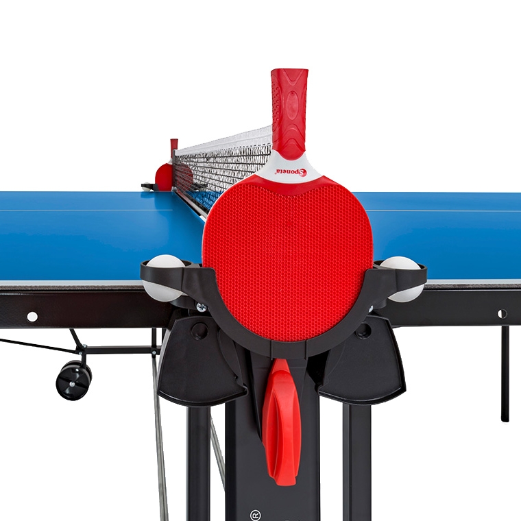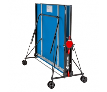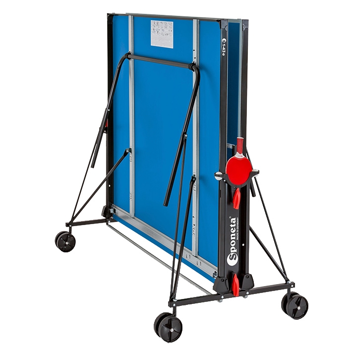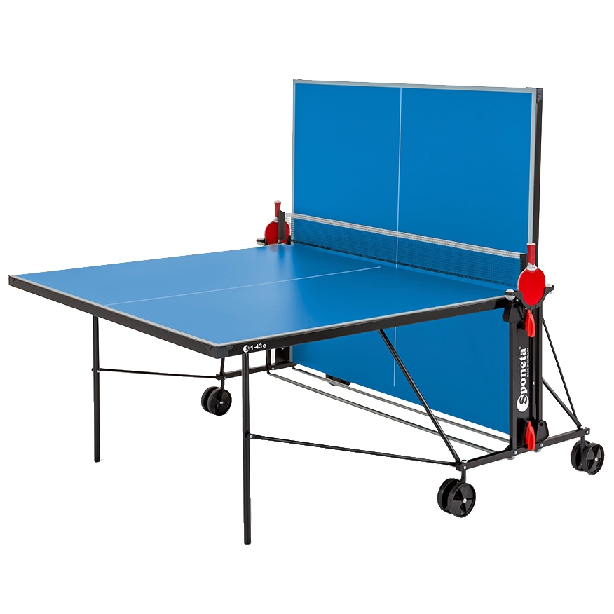 Стіл тенісний Sponeta S1-43e - ідеальна модель всепогодного тенісного столу, який може використовуватися як на вулиці, так і в приміщенні. Ідеальний вибір для заміського будинку. Влагоустойчивий на 100%, тому незалежно від природних умов, стіл може перебувати на відкритому повітрі цілий рік. Sponeta S1-43e - складна модель, що забезпечує зручність її зберігання та застосування в будь-яких умовах. Ігрова поверхня виконана з гумового меланіну, товщиною 4 мм. Стіл оснащений стрічкової рамою, товщиною 36 мм. Каркас виконаний з чорного металу, профілі округлої форми діаметром 25 мм. Система поворотних ручок з механізмом блокування в складеному стані дозволить безпечно зберігати стіл в будь-якому місці. Стіл оснащений 4 подвійними транспортувань поворотними колесами діаметром 125 мм, що істотно полегшує транспортування обладнання при необхідності. У комплект також входить сітка розміром 180х15,2 см і утримувач для ракеток і м'ячів.