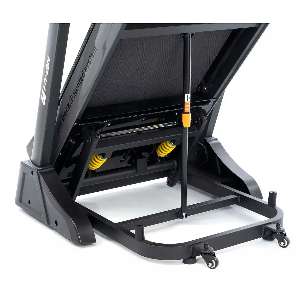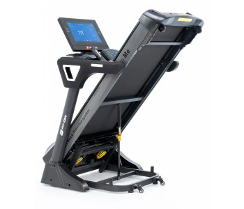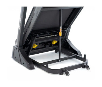 Компактна конструкція з унікальною підйомною системою дозволяє займати всього 1 м² у складеному вигляді. Транспортні ролики полегшують переміщення тренажера, а розкладання займає всього кілька секунд.