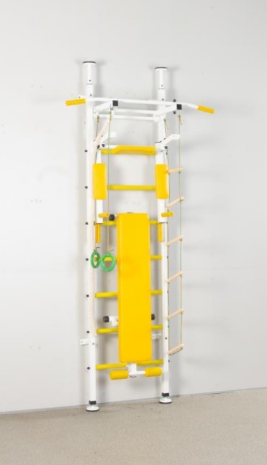 Шведська стінка СТ laquo; Персейraquo; виконана в універсальному класичному білому кольорі з жовтими елементами (ручки, м'яка частина лавки, спинка, підлокітники, поперечини).