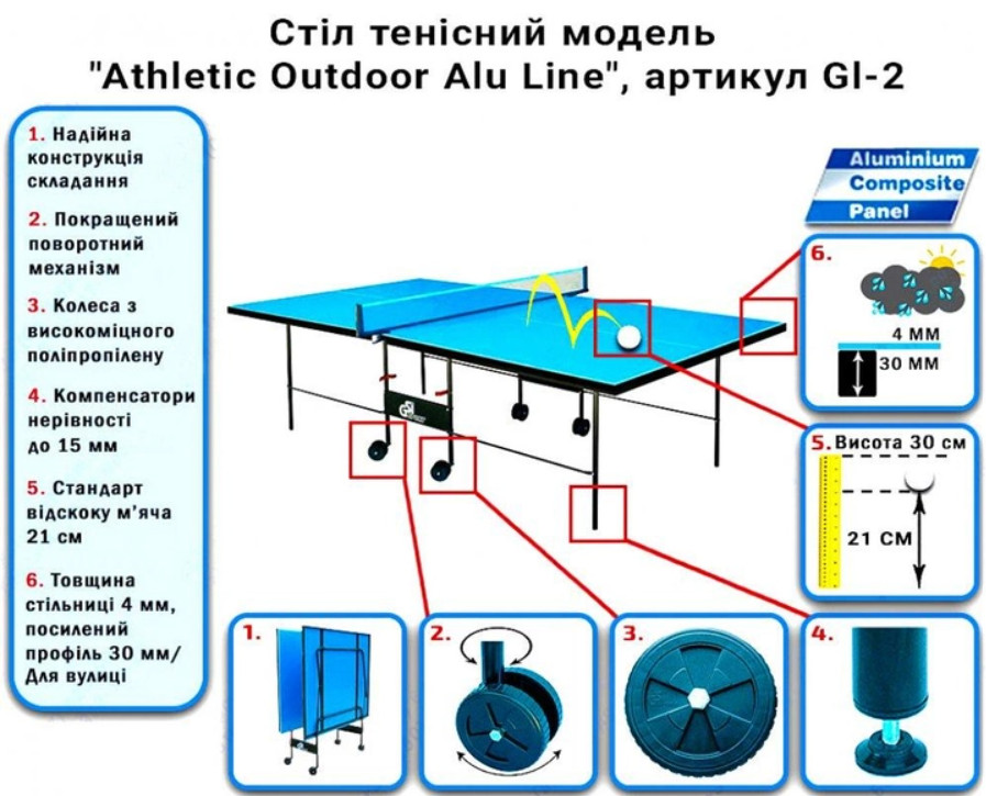 Всепогодний тенісний стіл із композитною алюмінієвою панеллю — ідеальне рішення для гри на відкритому повітрі та в приміщенні.